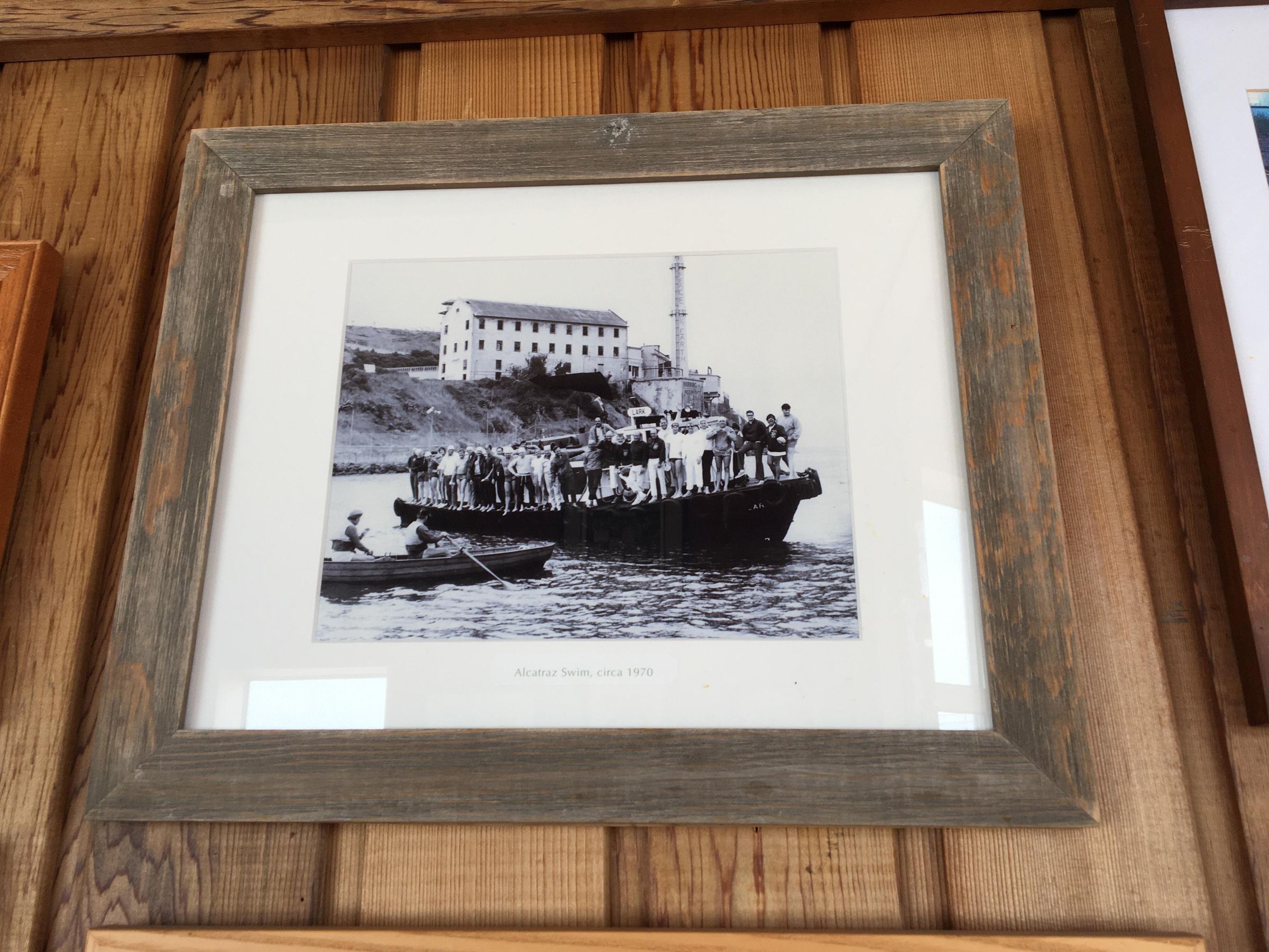 Building in background has word "Indian" graffitied on it. A nearby smokestack tower has "Peace on Earth" running down it vertically. Photo must have been taken during the occupation of Alcatraz (November 20, 1969 - June 1, 1971)