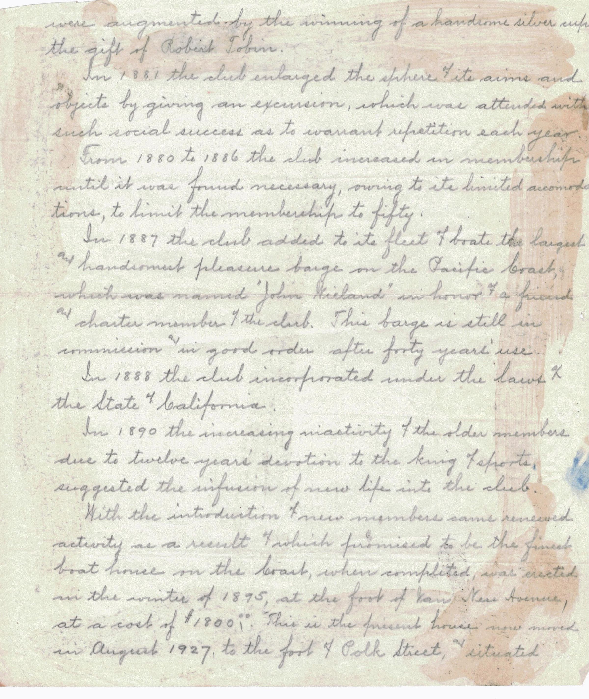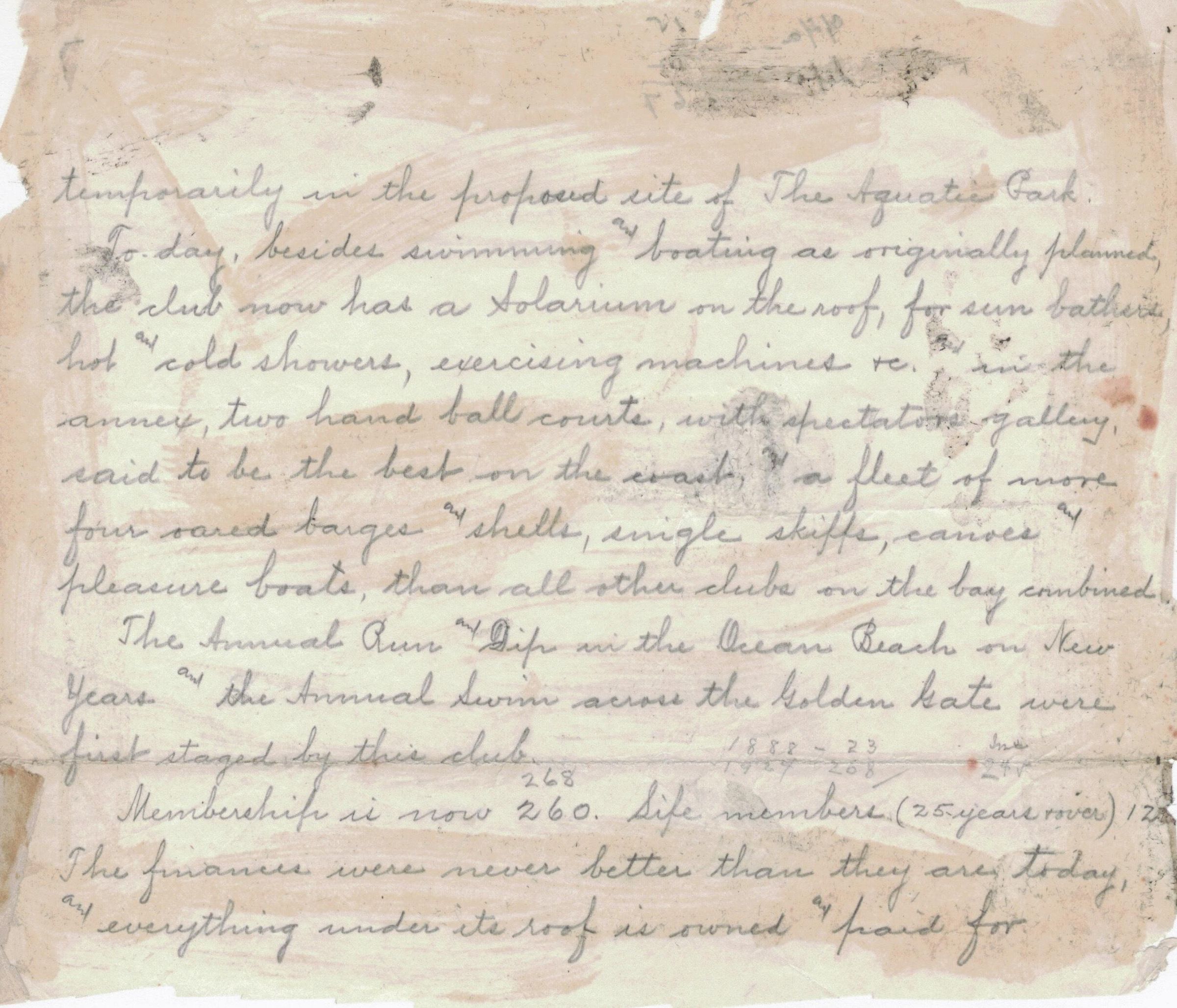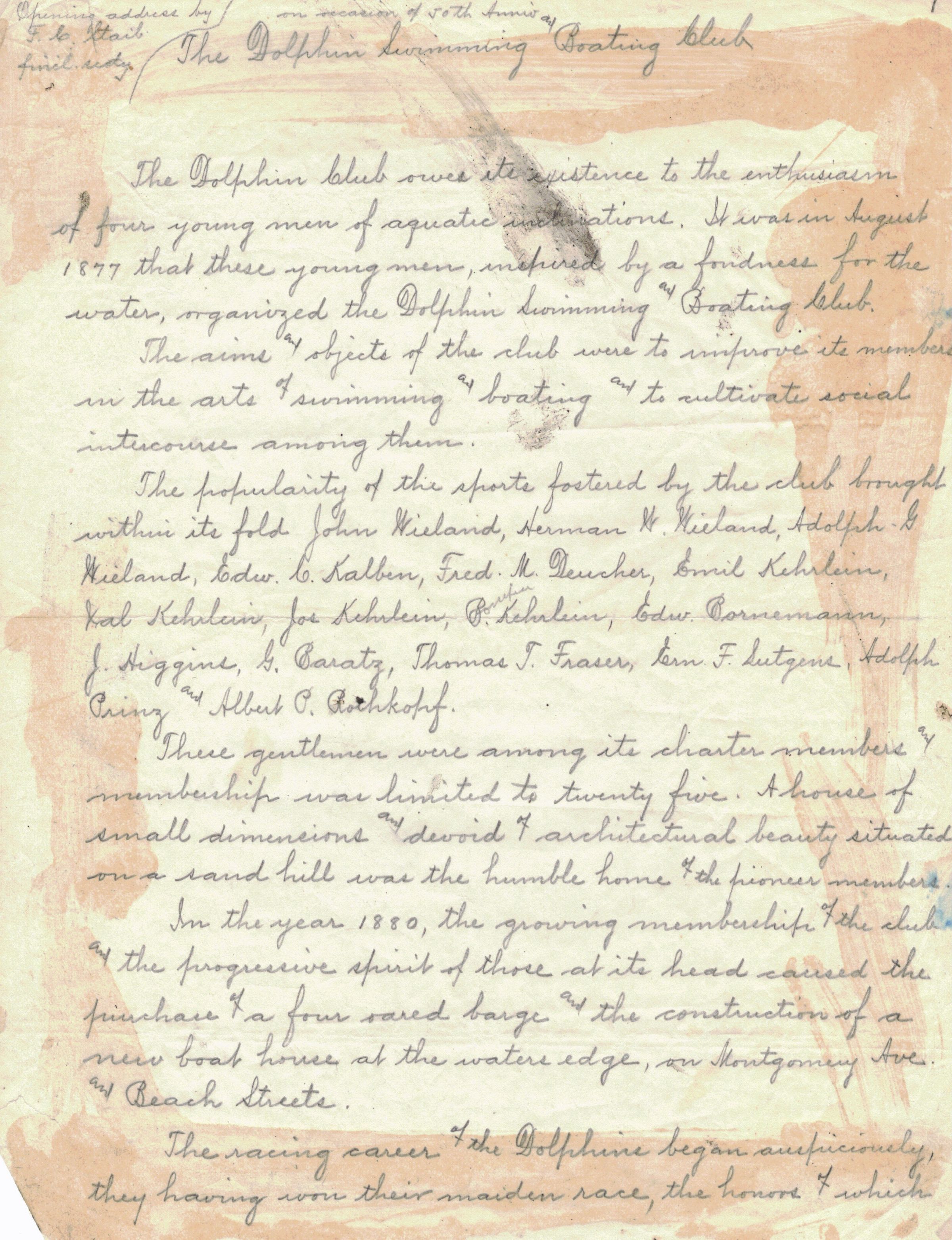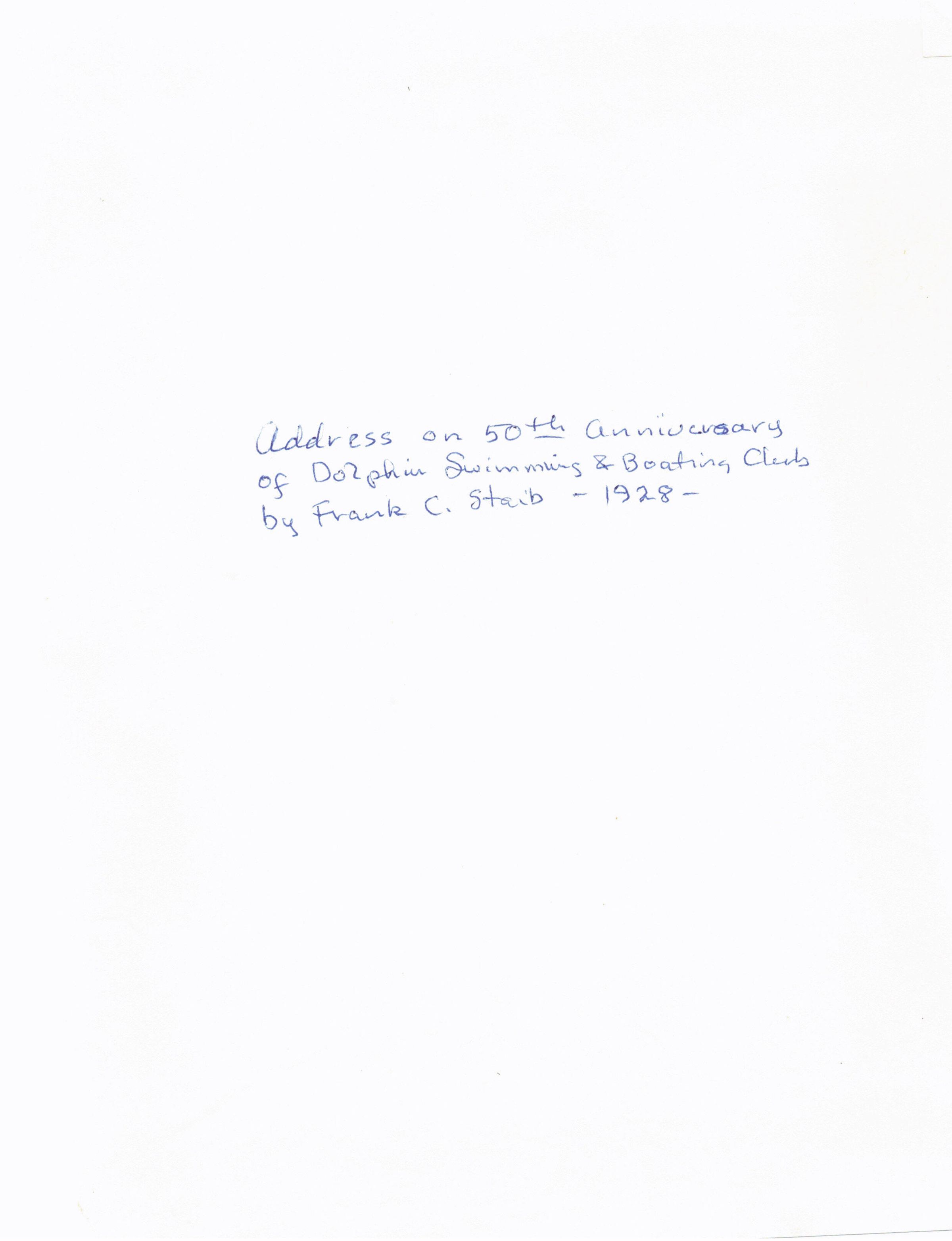 Handwritten notes for the speech given by Frank Staib on the 50th anniversary of the Dolphin Club