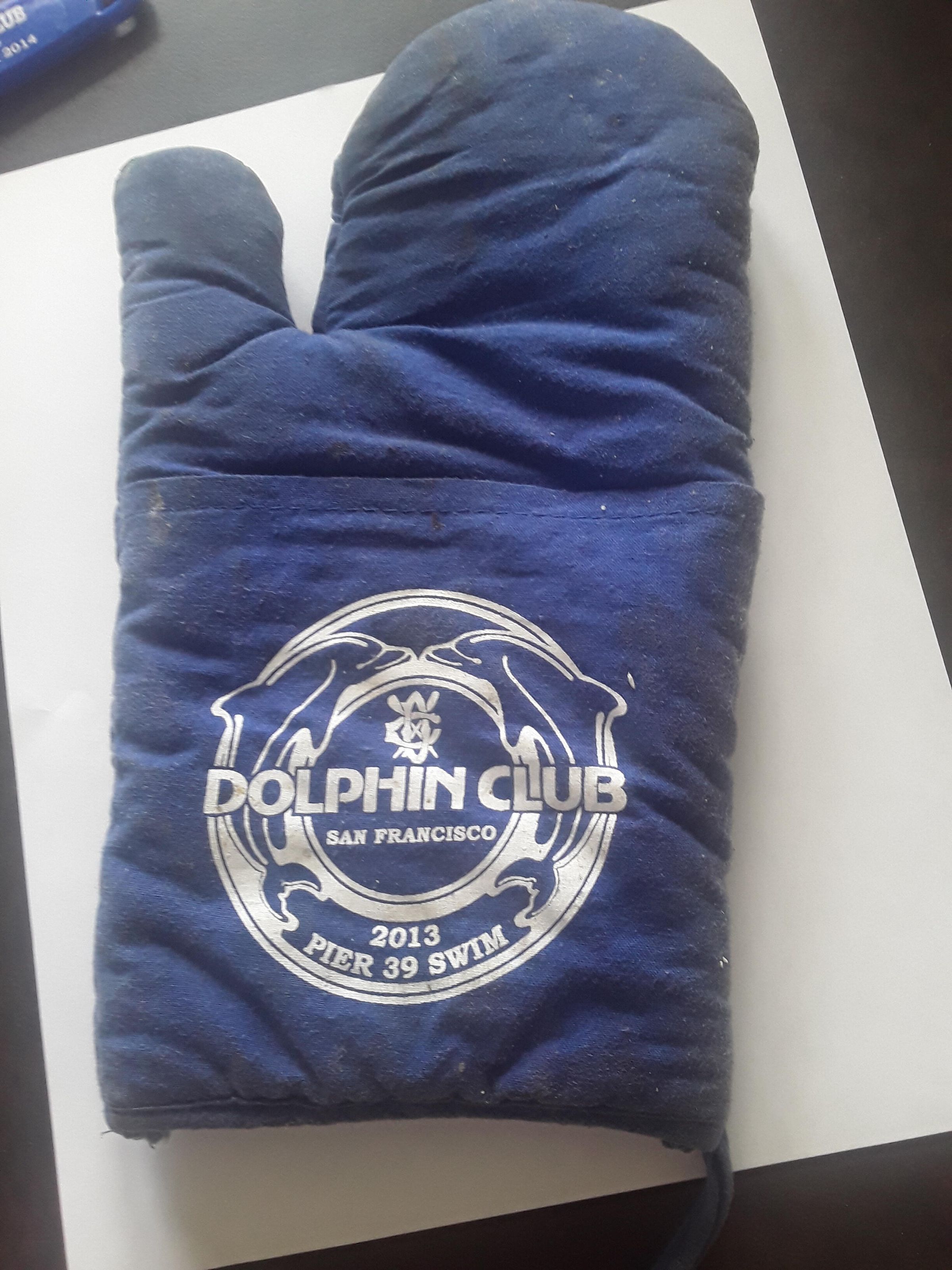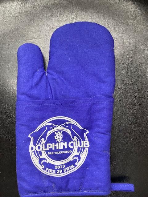 Blue oven mitt with white two-dolphin logo and 2013 Pier 39 Swim on lower section.