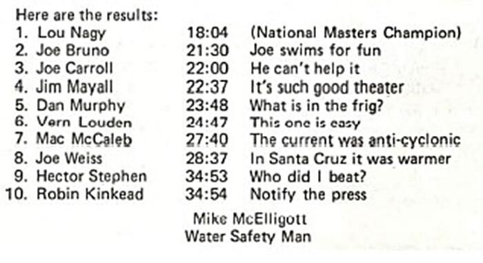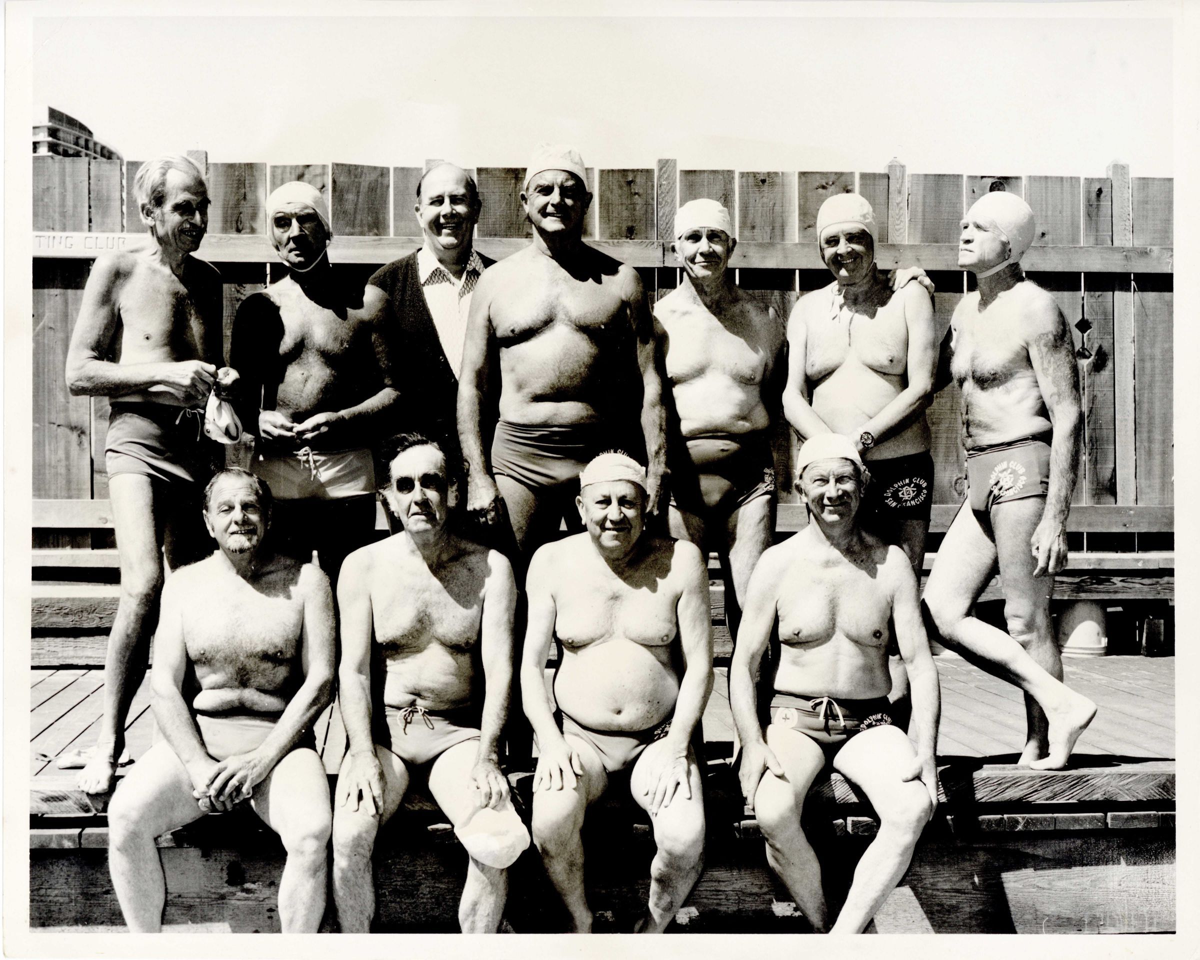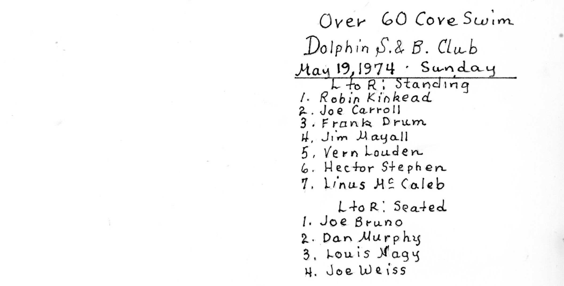 Over 60 Cove Swim 1974. Others pictured are Robin Kinkead, Joe Carroll, Jim Mayall, Vern Louden, Hector Stephen, Linus McCaleb, Lou Nagy, Joe Weiss.Subject Person or Organization