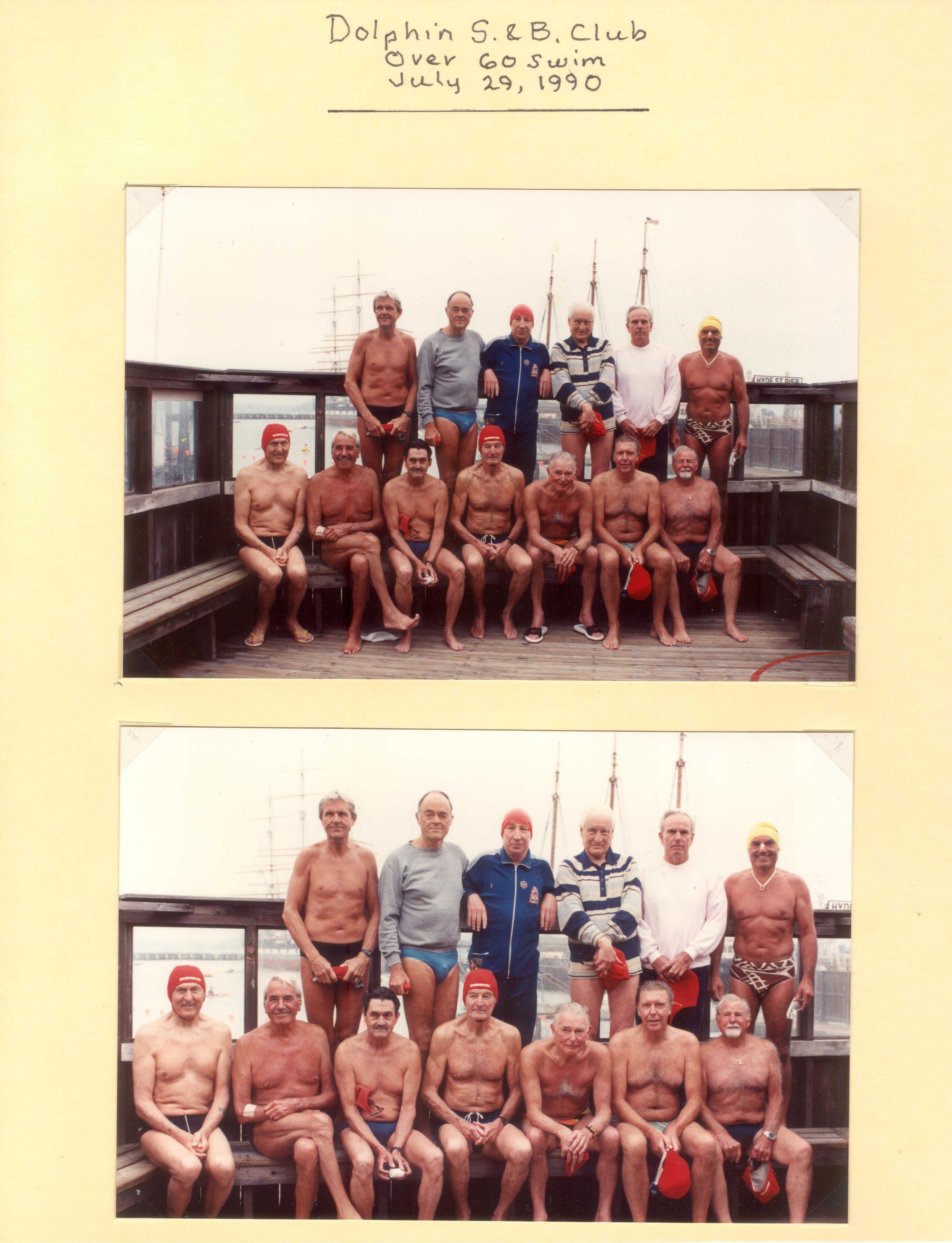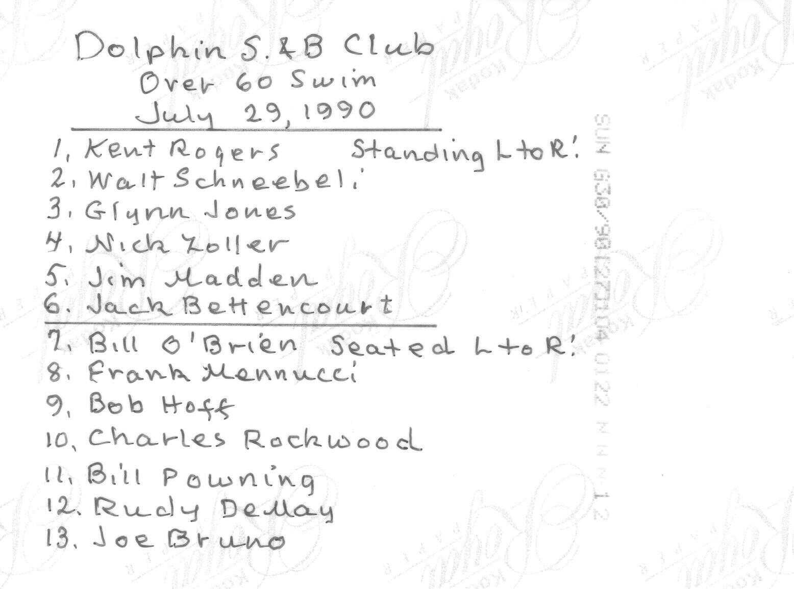 Over 60 Swim 1990: Standing Rogers, Schneebeli, Jones, Zoller, Madden, Bettencourt, Seated O'Brien, Mennucci, Hoff, Rockwood, Powning, DeMay, Bruno.Subject Person or Organization