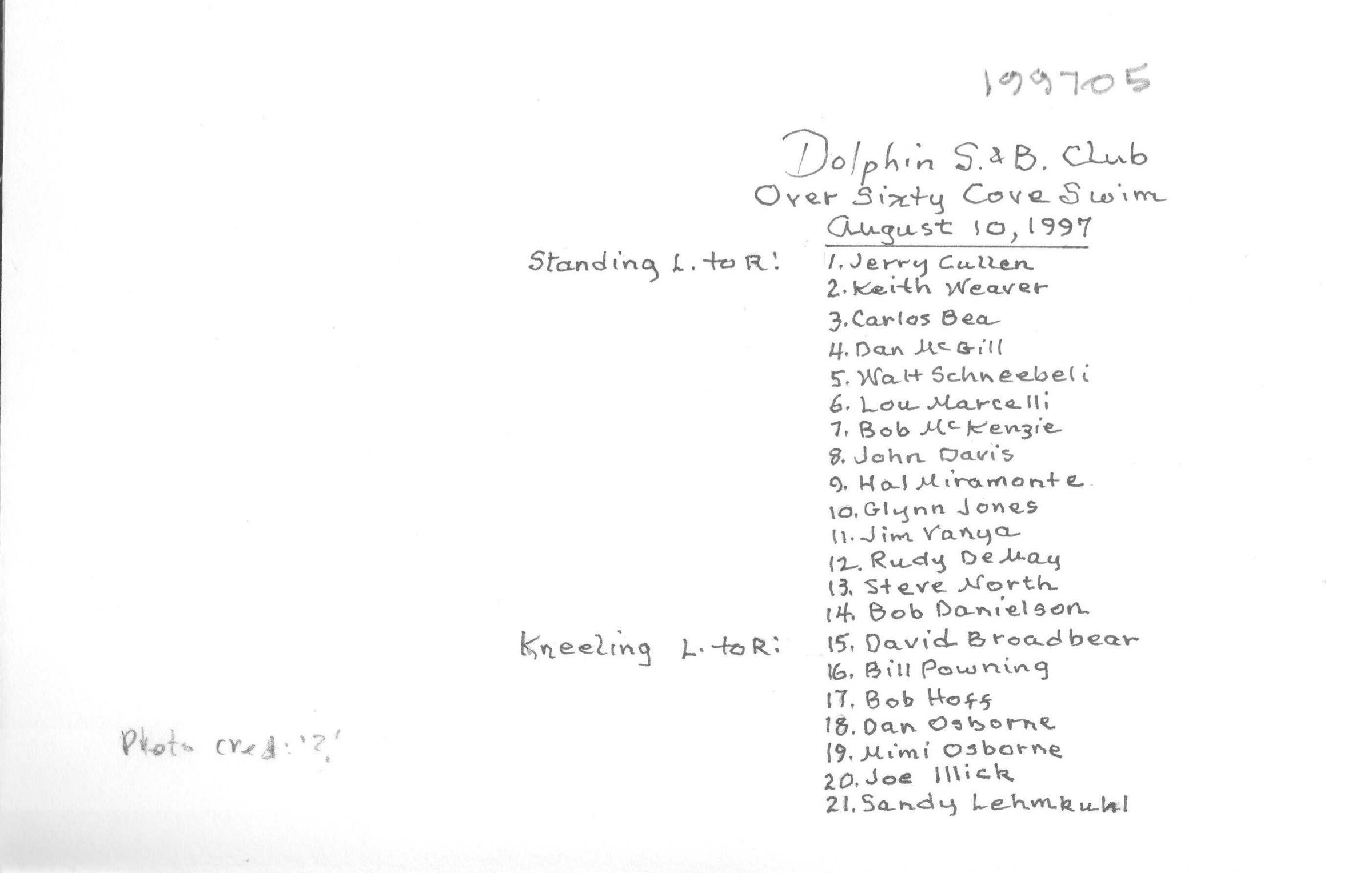The Over-60 Swim 1997: Standing Cullen, Weaver, Bea, McGill, Schneebeli, Marcelli, McKenzie, Davis, Miramonte, Jones, Vanya, DeMay, North, Danielson, Kneeling Broadbear, Powning, Hoff, Dan Osborne, Mimi Osborne, Illick, LehmkuhlSubject Person or Organization
