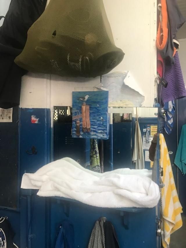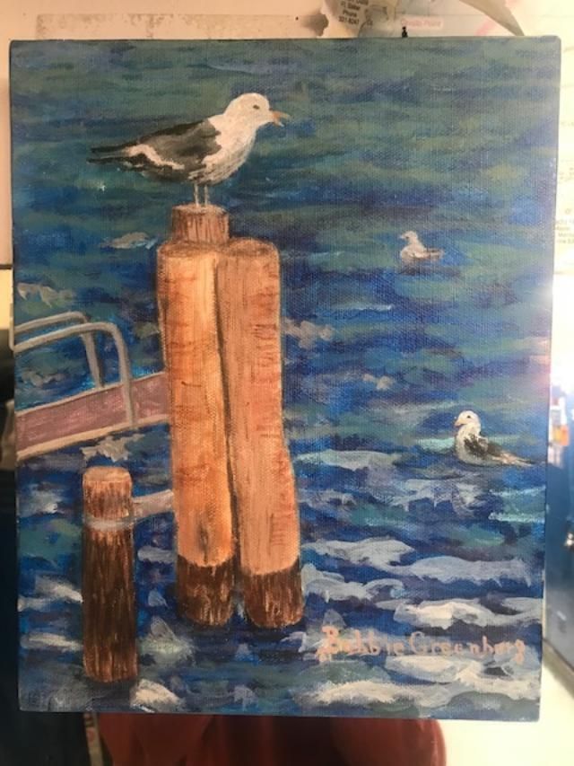 Oil painting on canvas no frae. Shows seagull sitting on one of three pilings with ramp behind on left. Two seagulls in water.