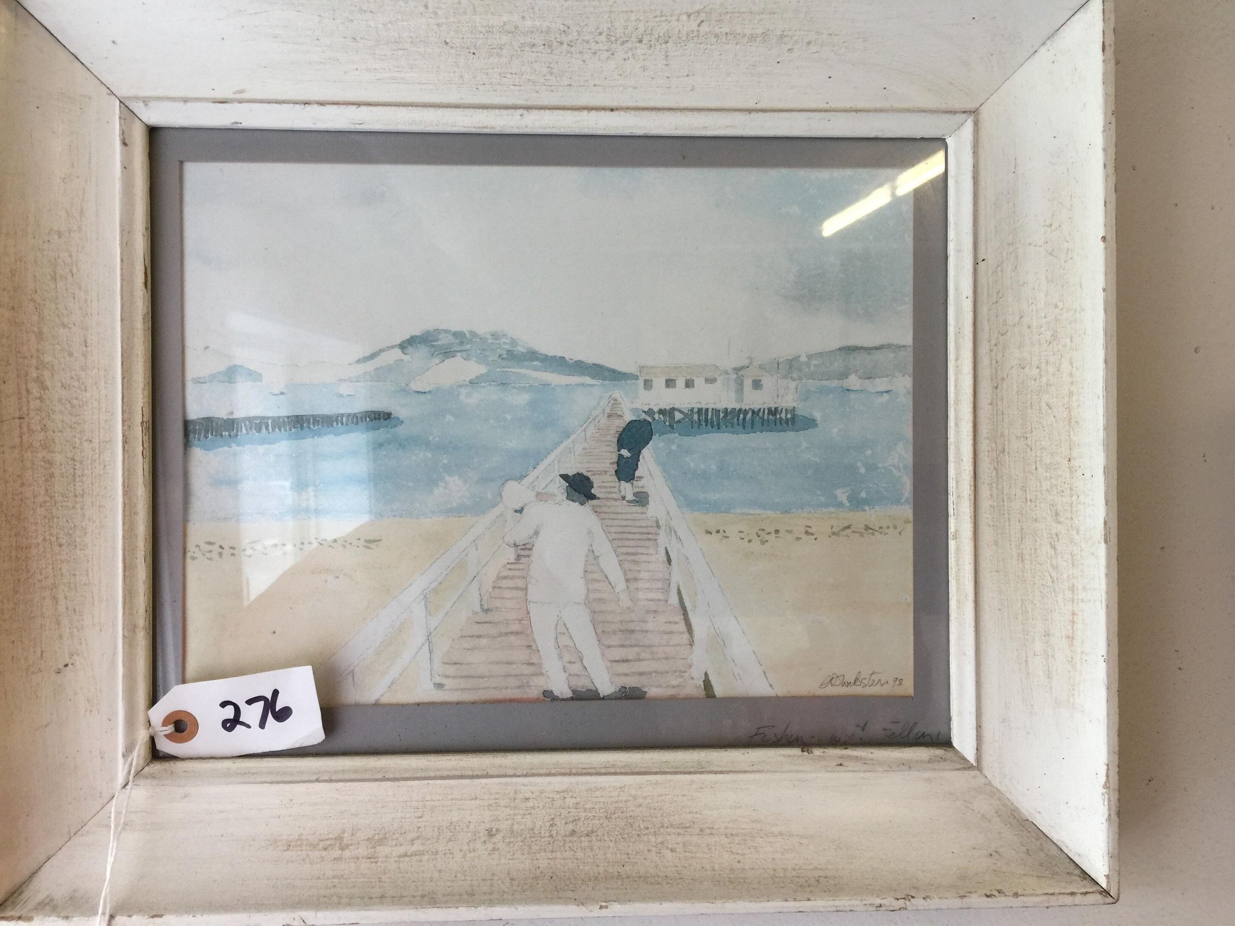 Framed watercolor painting showing beach, two men on a pier that leads out to a building on wooden pilings. Pastel blue and tan palette, taupe brown mat, off white wooden frame with glass.