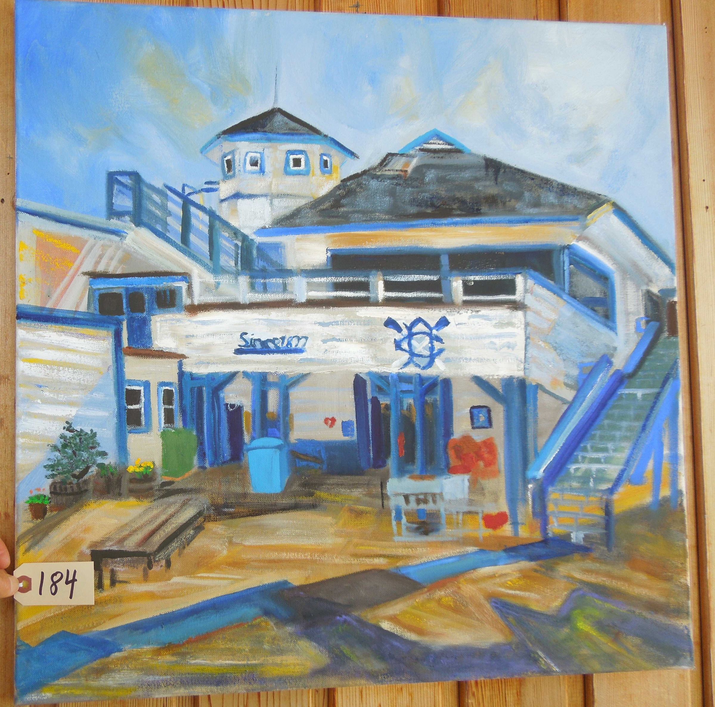 Unframed canvas oil painting of Dolphin Club building from the pier, looking back at club;