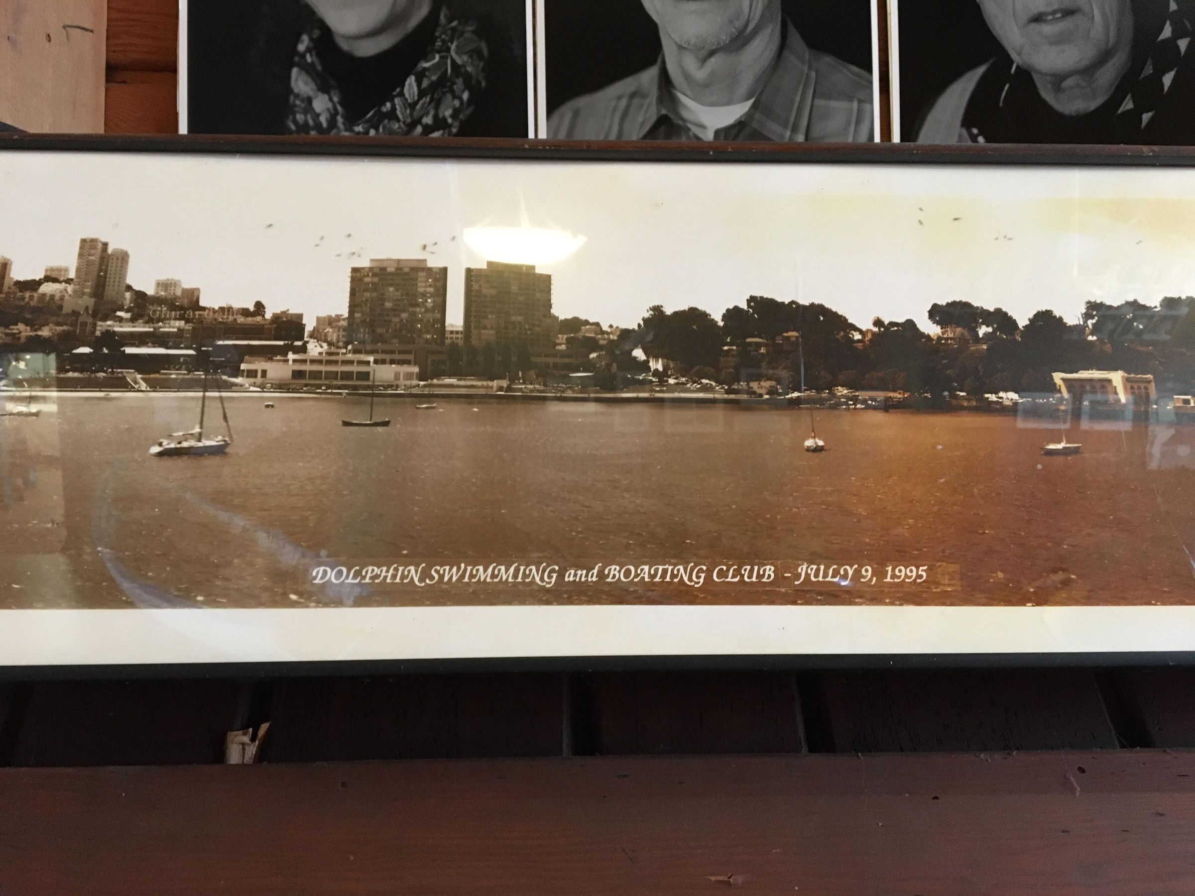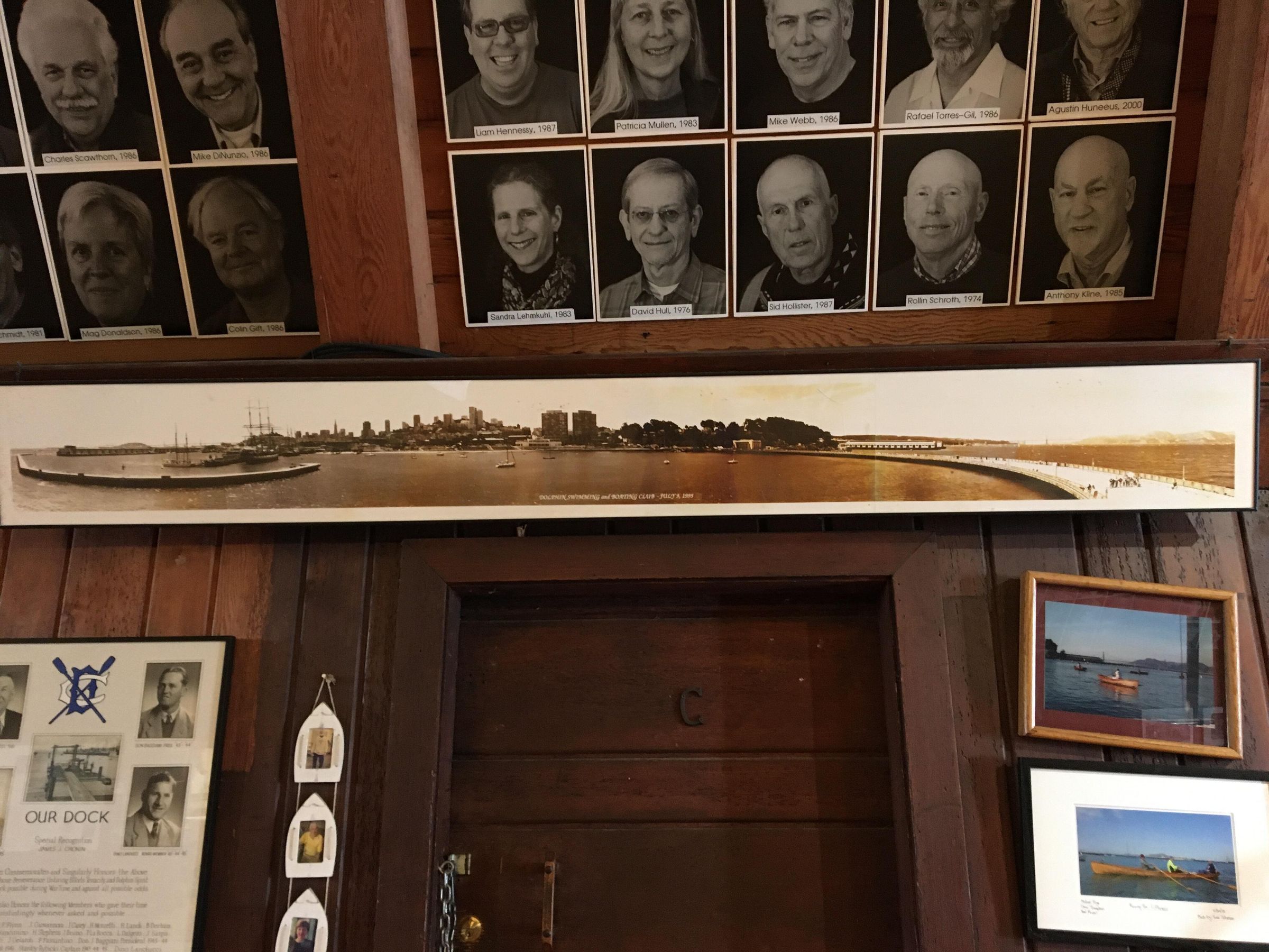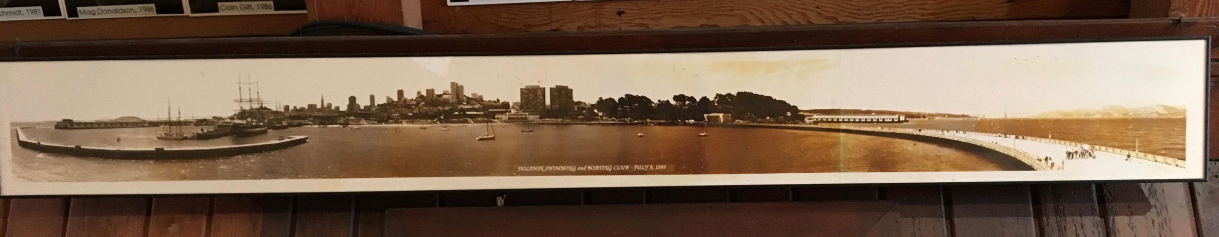 July 2020 on west wall of main boat house south of stage above door to store room by stairs. Mounted on a board.
