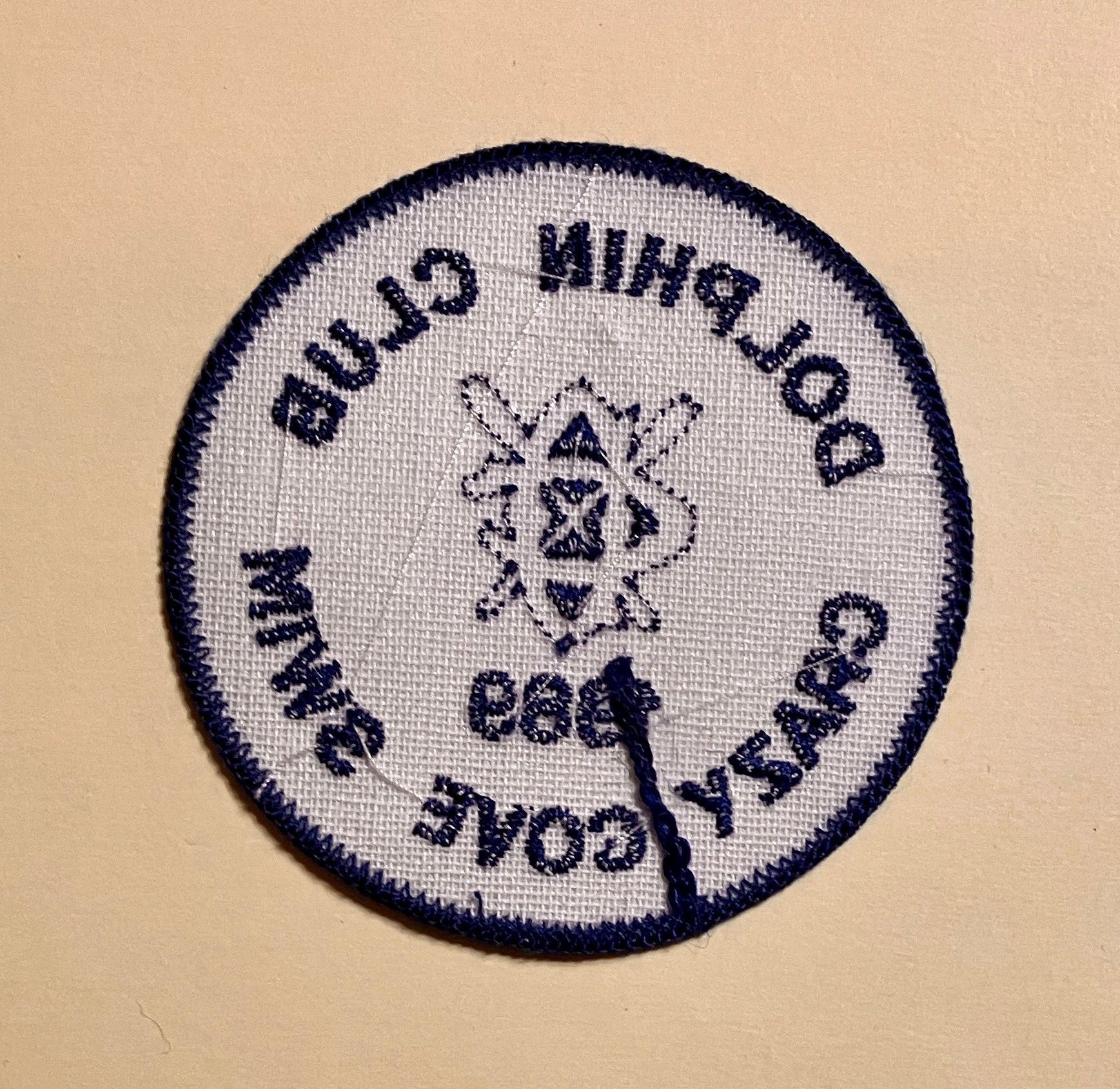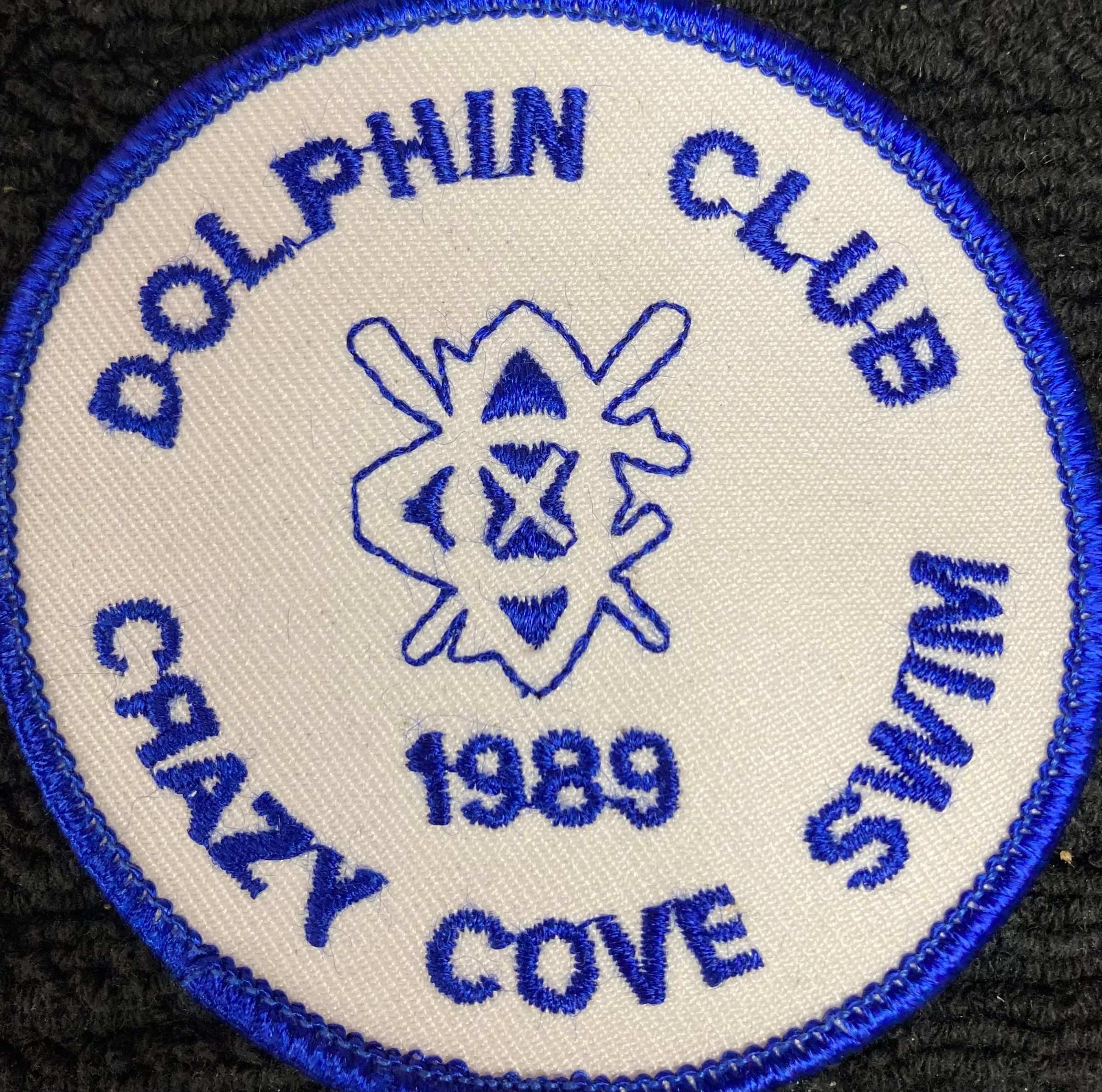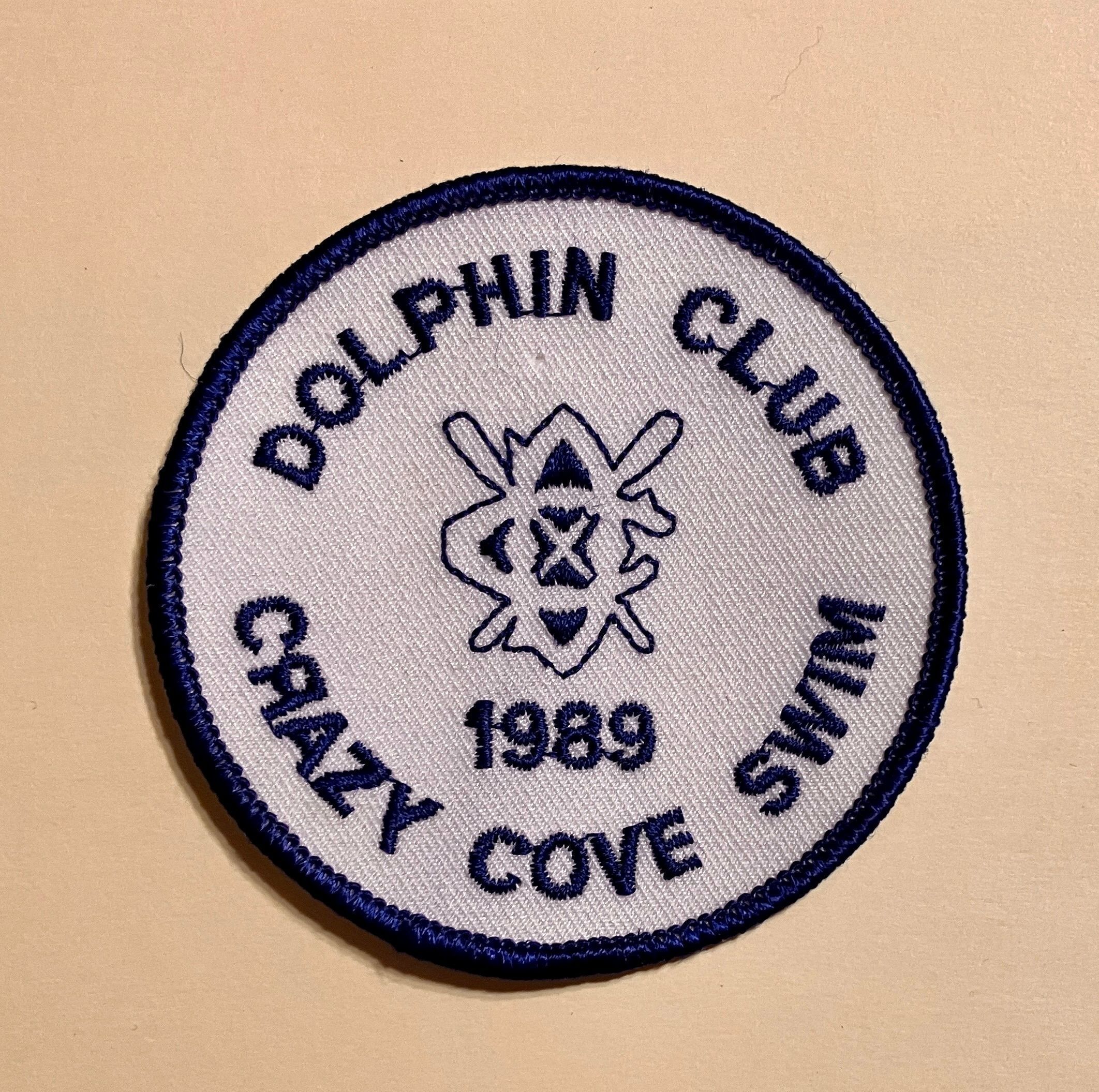White embroidered patch with blue edges and pint. Text: "Dolphin Club - outlined crossed oars logo - 1989 - Crazy Cove Swim."