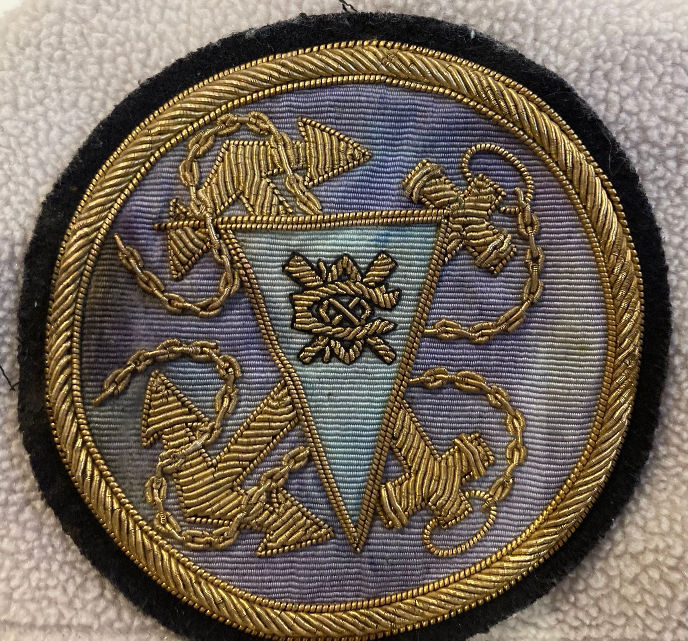 Very old Dolphin Club embroidered patch. Round cloth black background, gold embroidered border, blue field in which are two embroidered crossed anchors with chains, in center over where anchors cross is a bottom up light blue triangle with gold embroidered crossed oars logo.