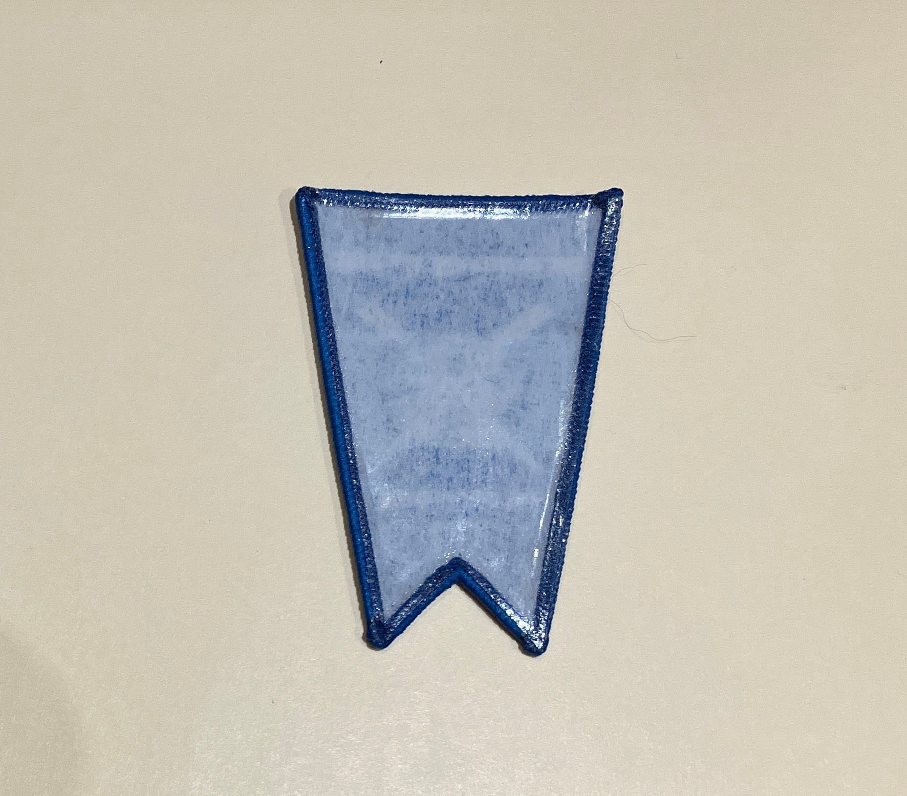 Light blue patch with blue stitching on edges and blue text. Burgee shape, vertical orientation