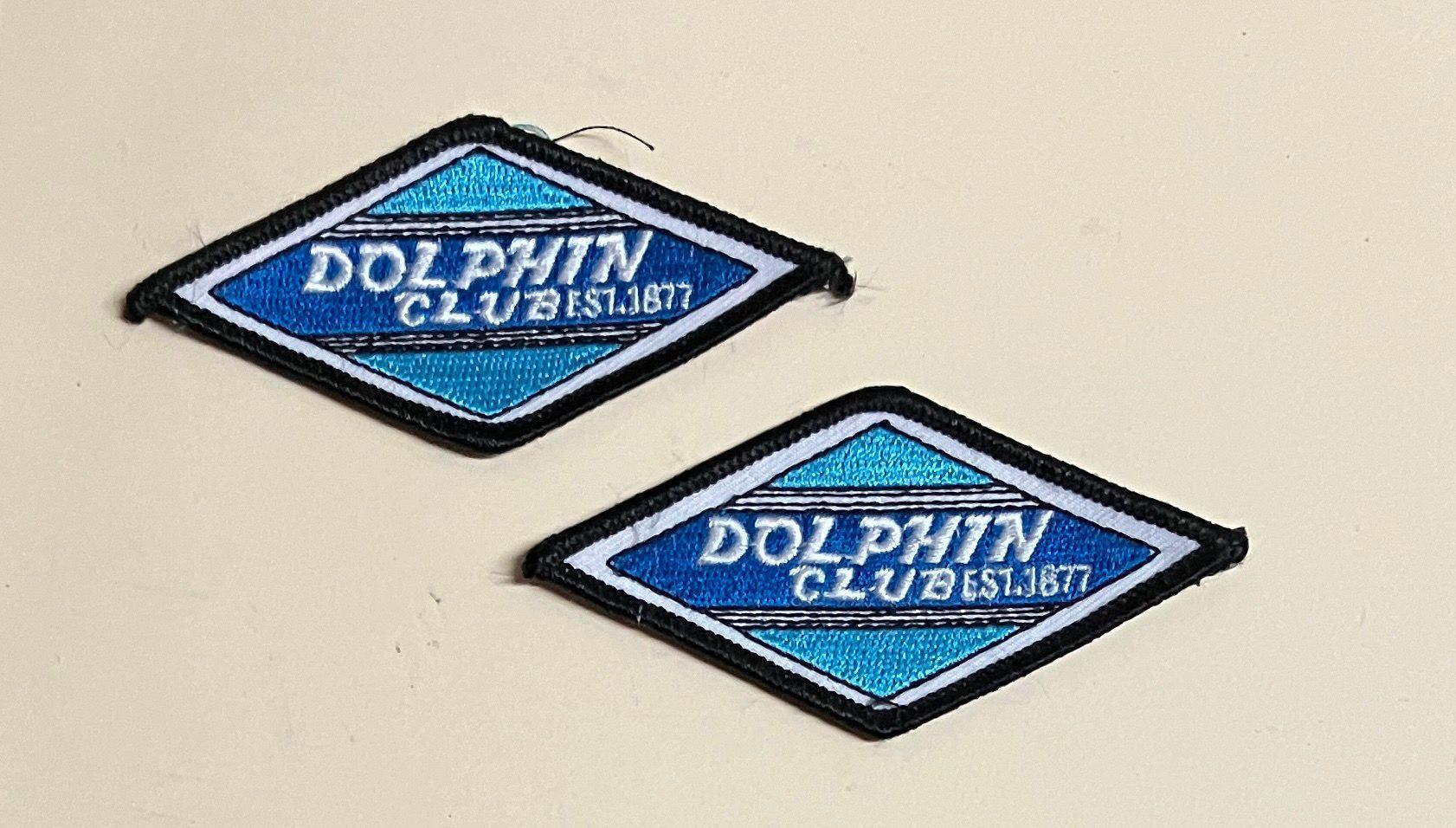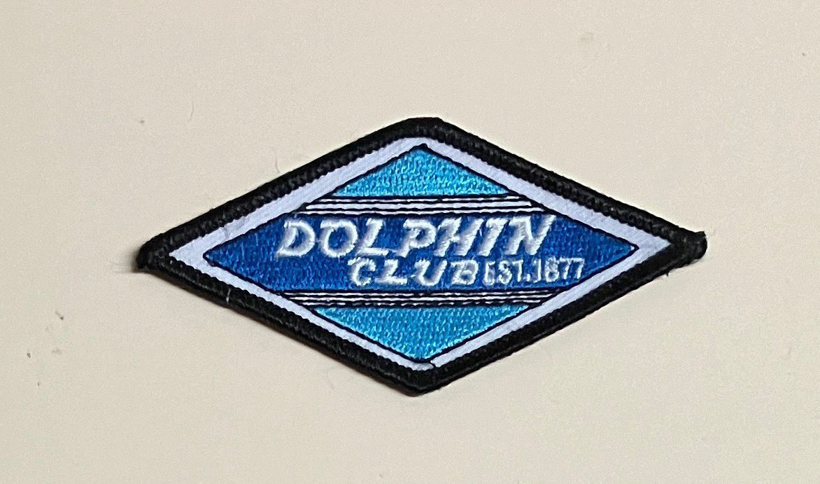 Center bar is dolphin blue with words in white stitching: Dolphin - Club Est 1877