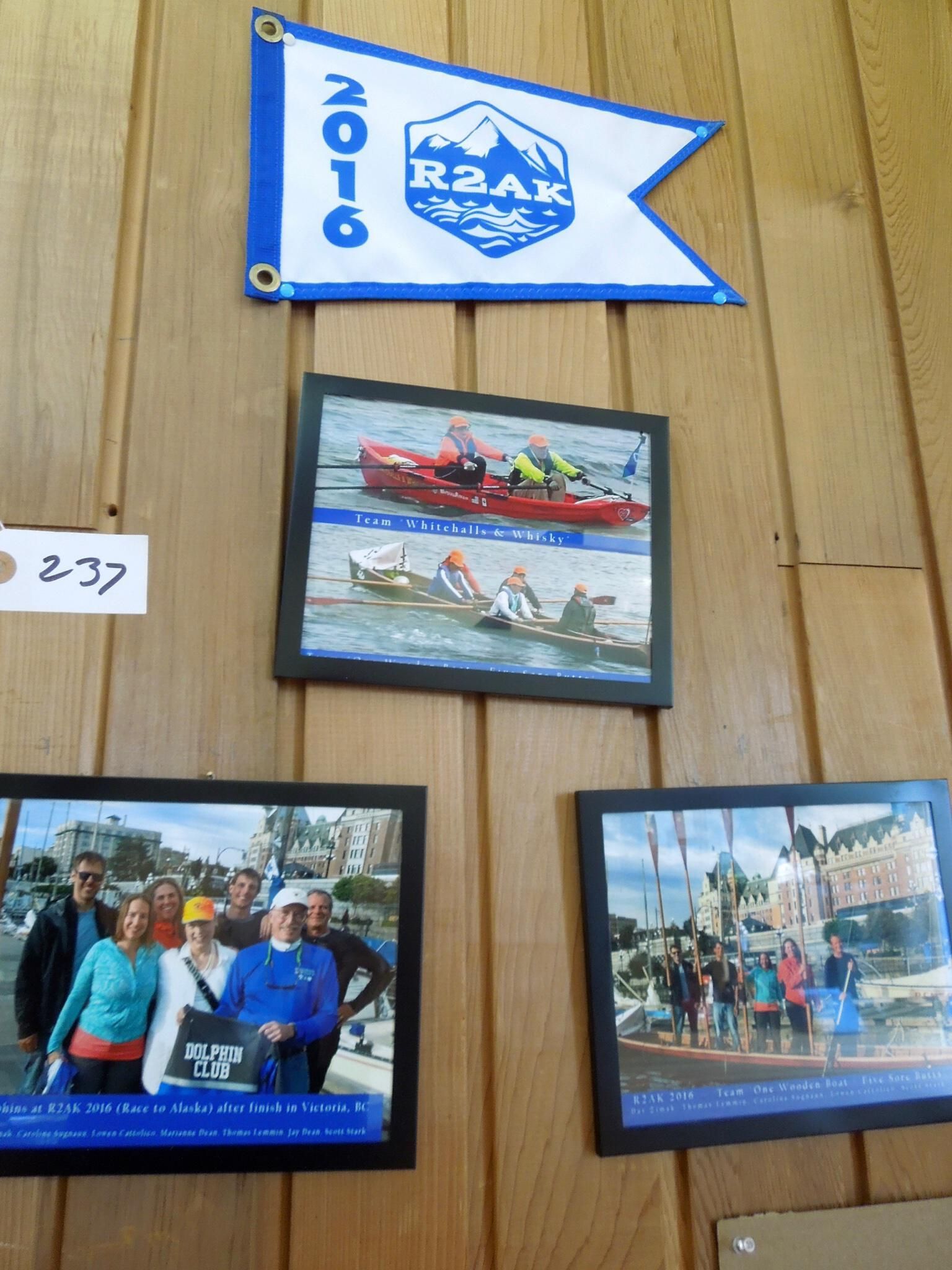 Burgee shaped blue on white cloth pennant, hanging above 3 framed photos of Dolphin Club teams: 1 of rowers in boats, and 2 at finish of race in Victoria, BC.