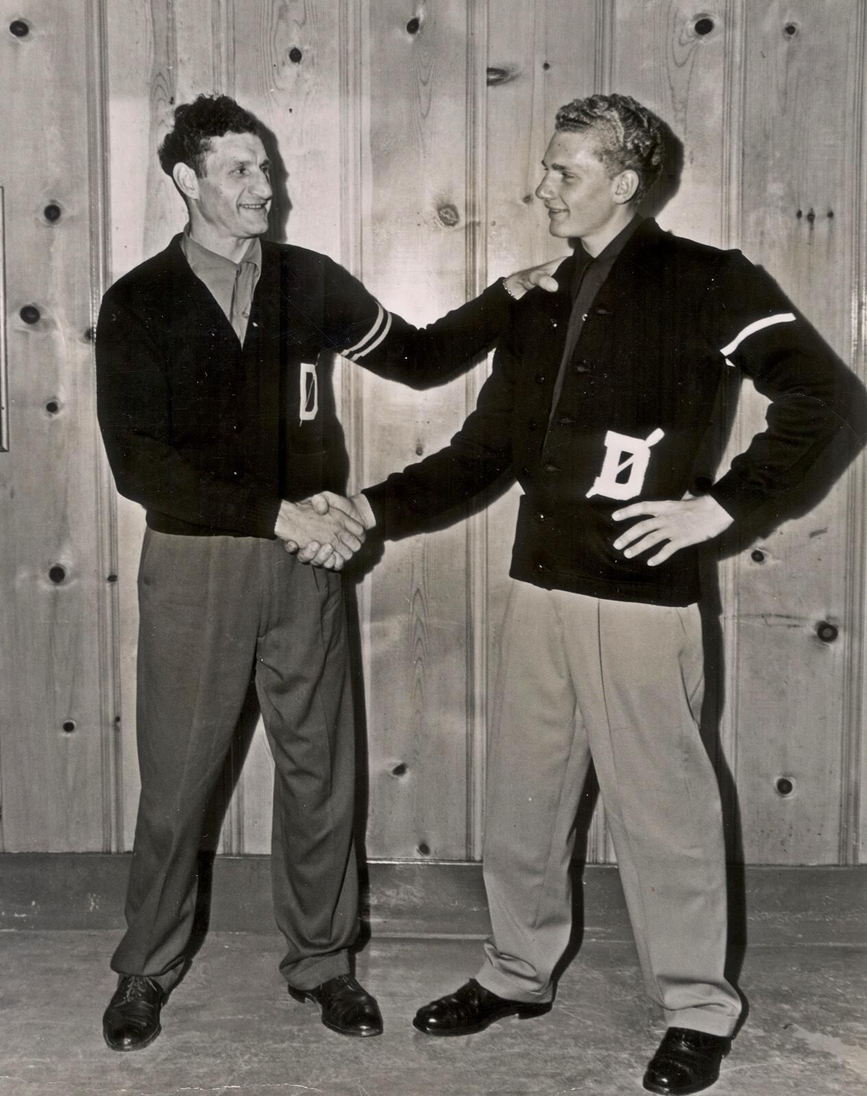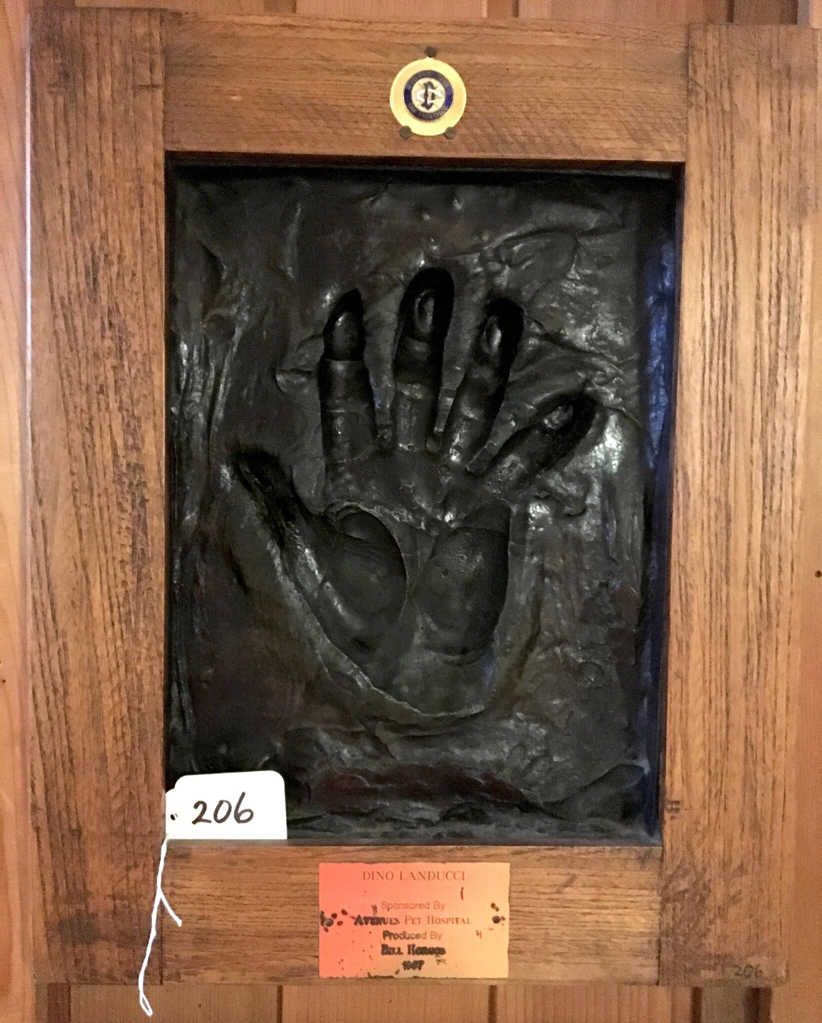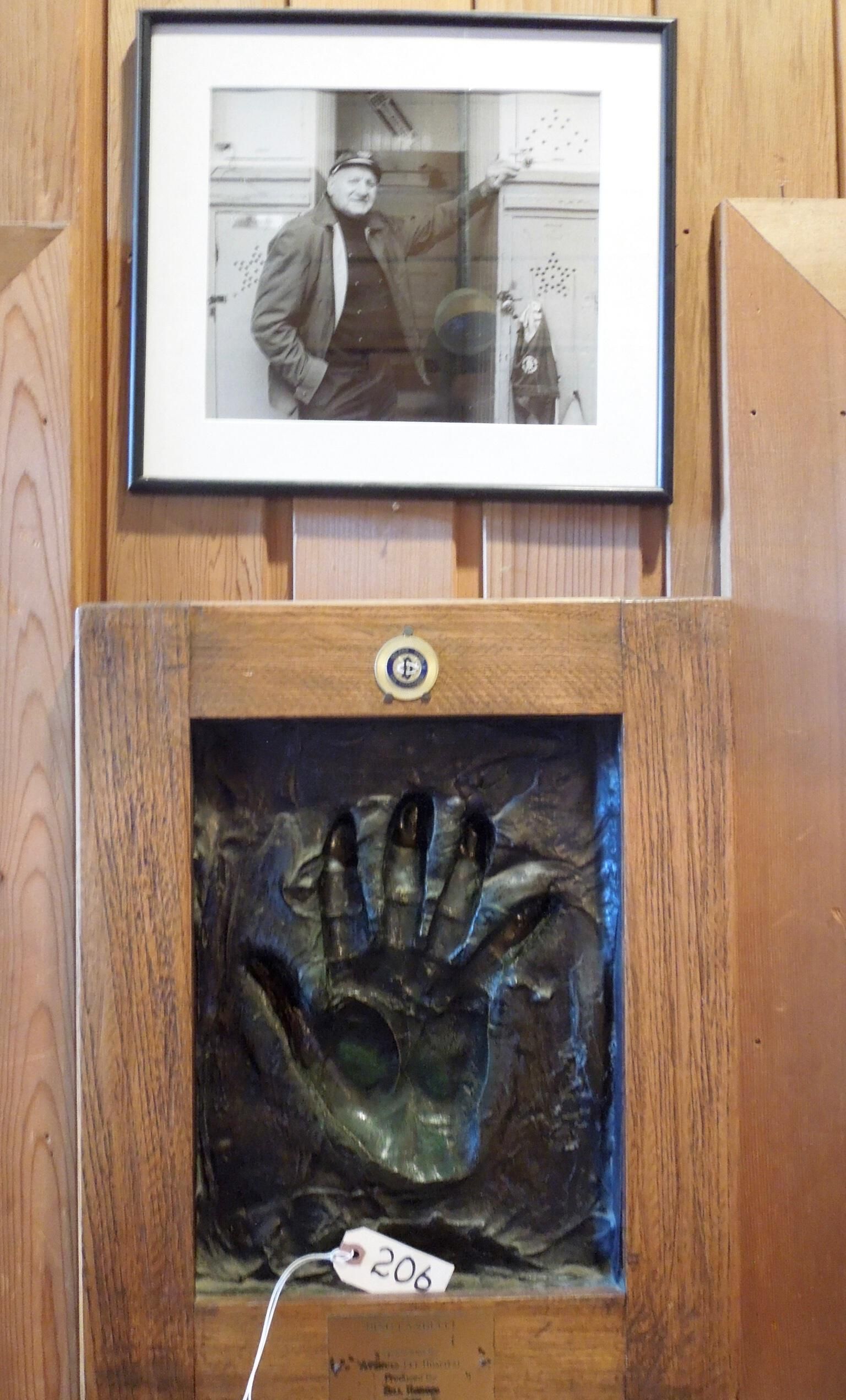 Bronze hand print of Dino Landucci right hand in wood frame; Framed photograph of Dino Landucci below framed hand mold.
