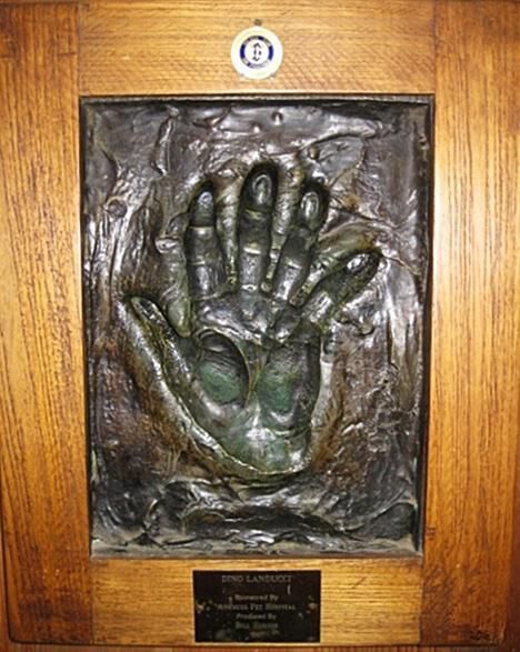 Text on metal plate on lower part of frame of hand mold: "Dino Landucci - Sponsored by - Avenues Pet Hospital - Produced by - Bill Horgos (? illegible) - 1987 (1967? illegible )"Made/Created