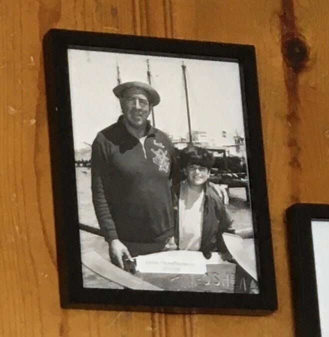 Photo of life member Emilio "Horse" Massucco and boy on pier at Club with name board of boat Tim O'Shea. Massucco was a member from 1948-1988.