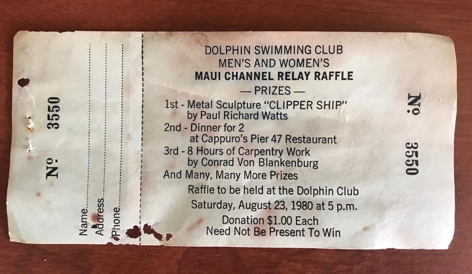 Raffle ticket to support women's and men's Maui Channel teams, drawing on August 23, 1980.