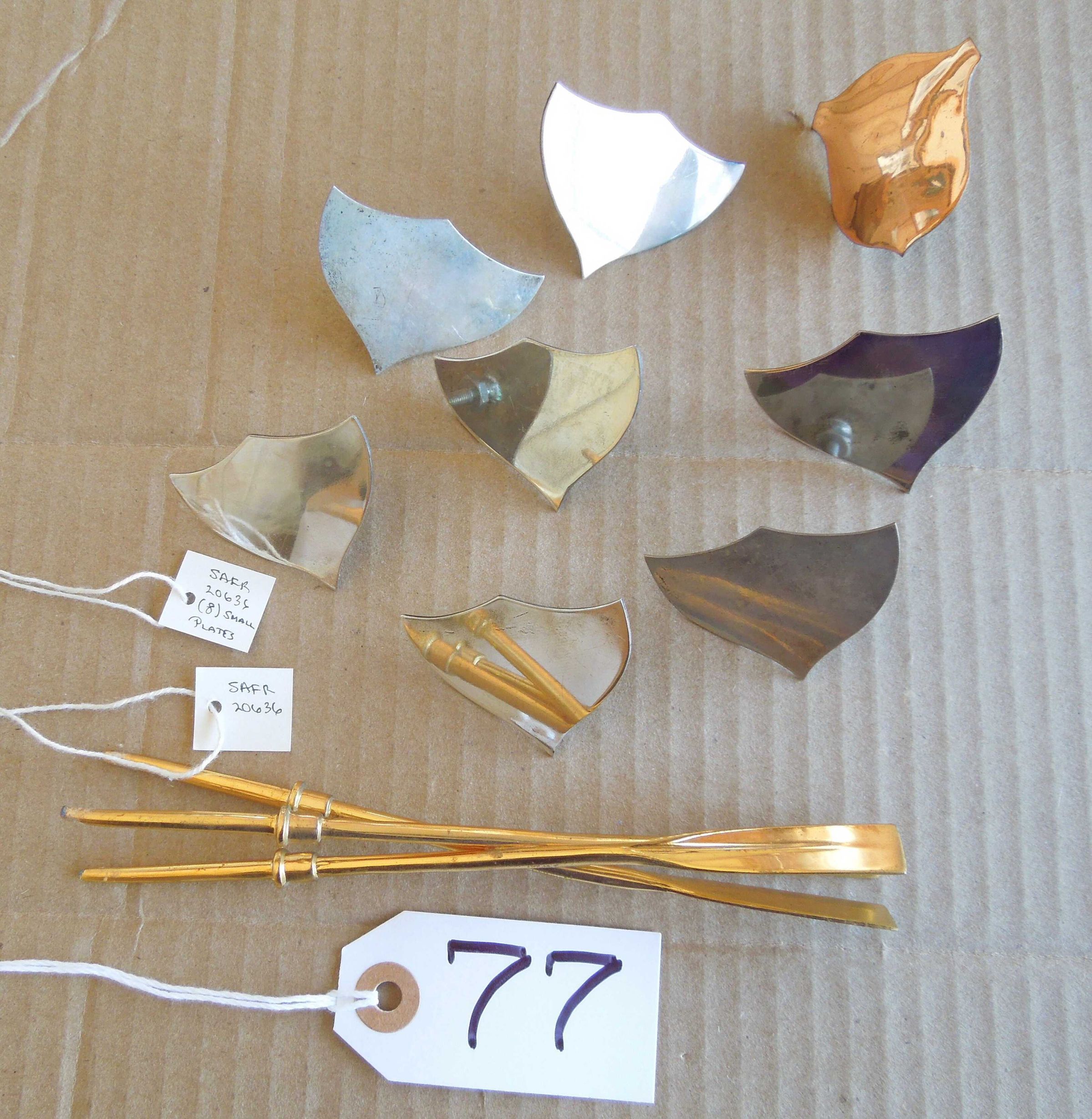 7 small silver tone transom shaped plates, 1 small brass tone shield shaped plate, 4 small brass tone oars attached to each other; found inside trophy Artifact 075;