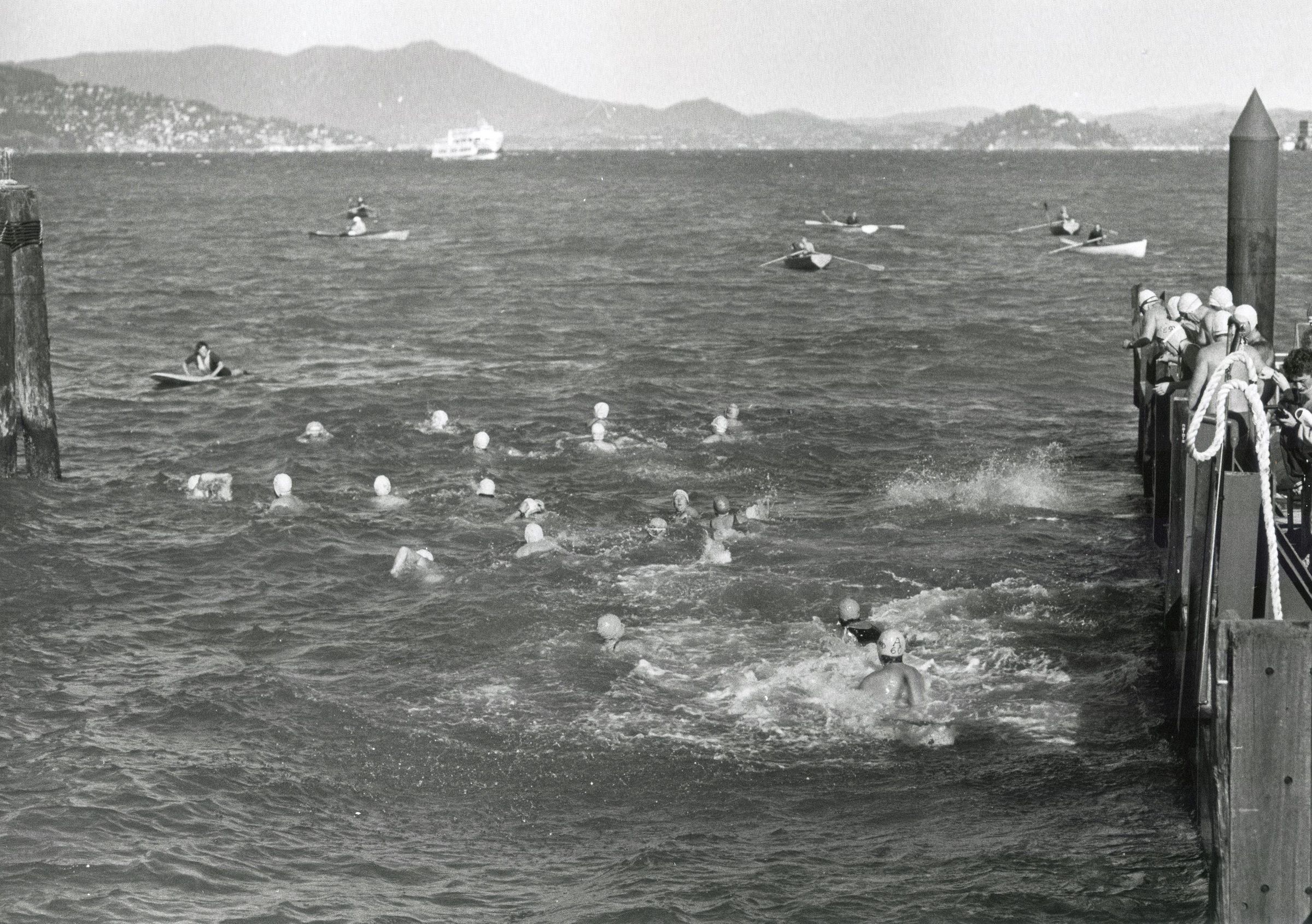 Start of the Pier 41 race back to the clubhouse at Aquatic Park. There were 54 swimmers, and Charlie Yourd finished first with a time of 18:22 minutes.Subject Place
