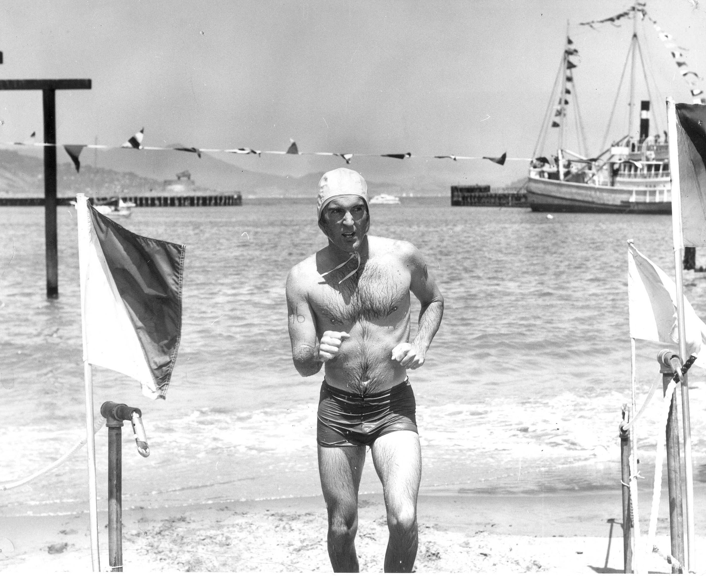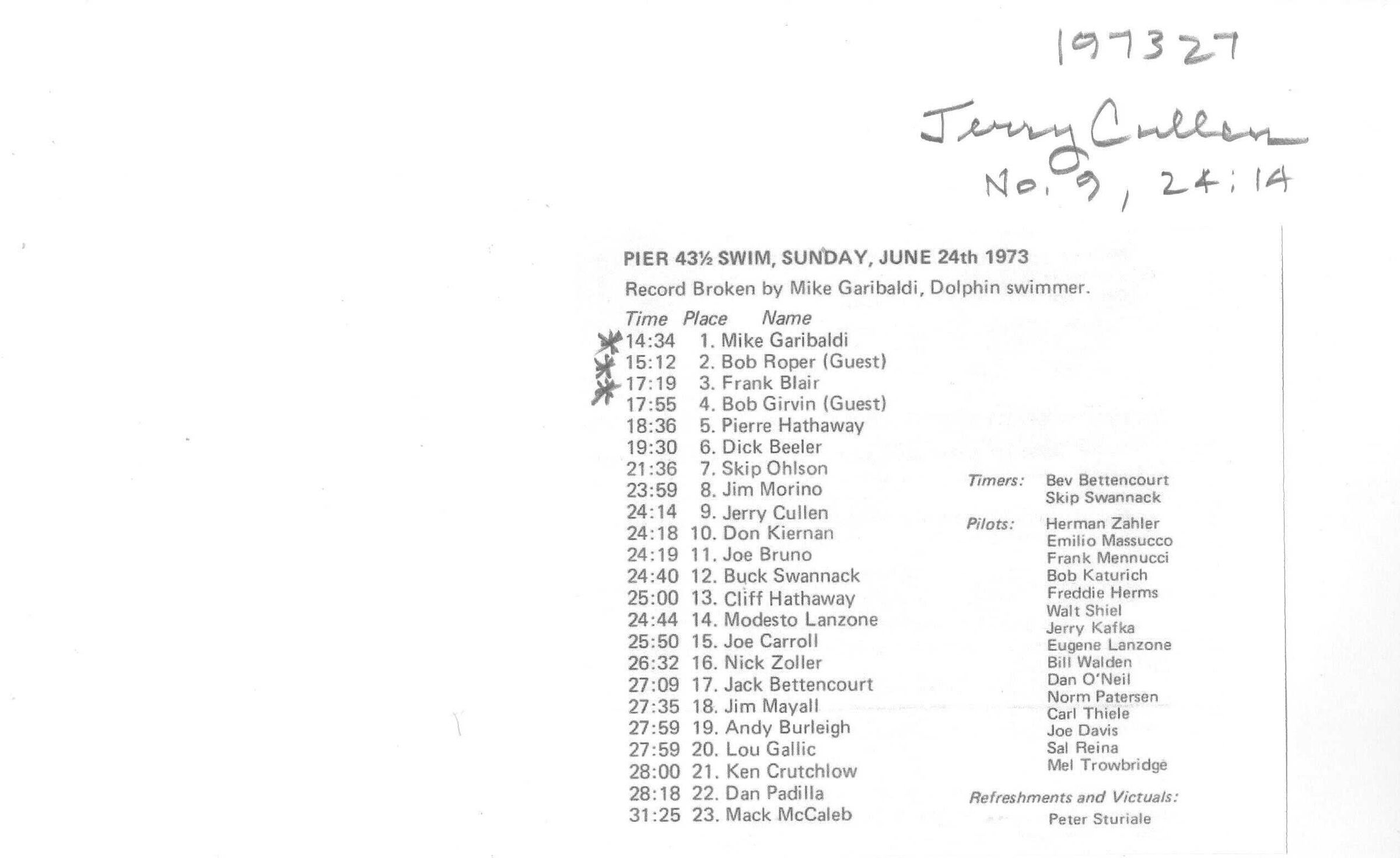 Jerry Cullen completing the Pier 43-1/2 Swim 1973