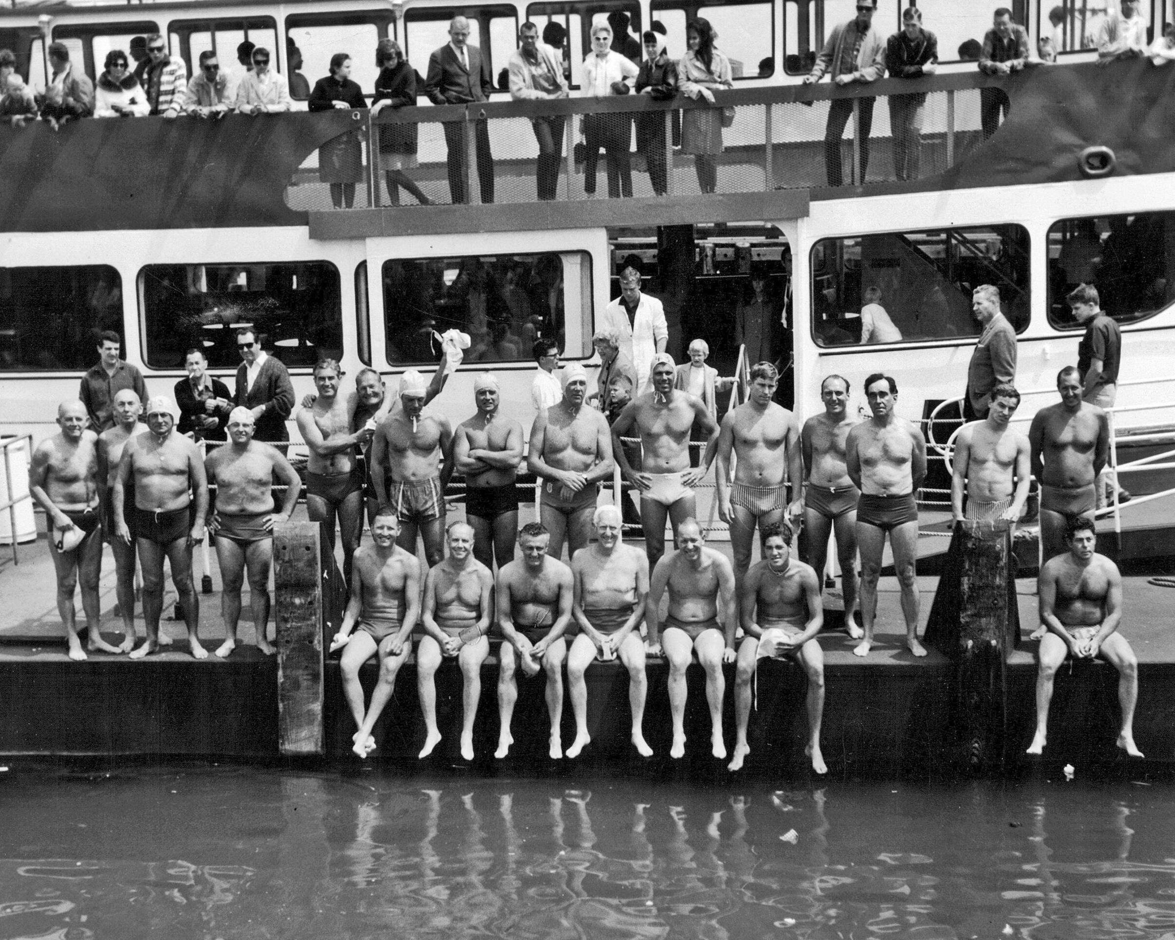 Pier 43-1/2 Swimmers L to R: Standing - Ted Monell, Chet Wing, Andy Franco, Joe Bruno, Jim Vanya, Walt Stack, unknown, Jack Nichols, Frank Drum, Mike Milliman, John Parent, Jerry Cullen, Dan Murphy, Mark Haskell, Bob Jimenez. Seated - Bob Rose, Vern Louden, Phil Rourke, Bill Greer, Bill Pech, Dave Papke, Bob Webb.Subject Person or Organization