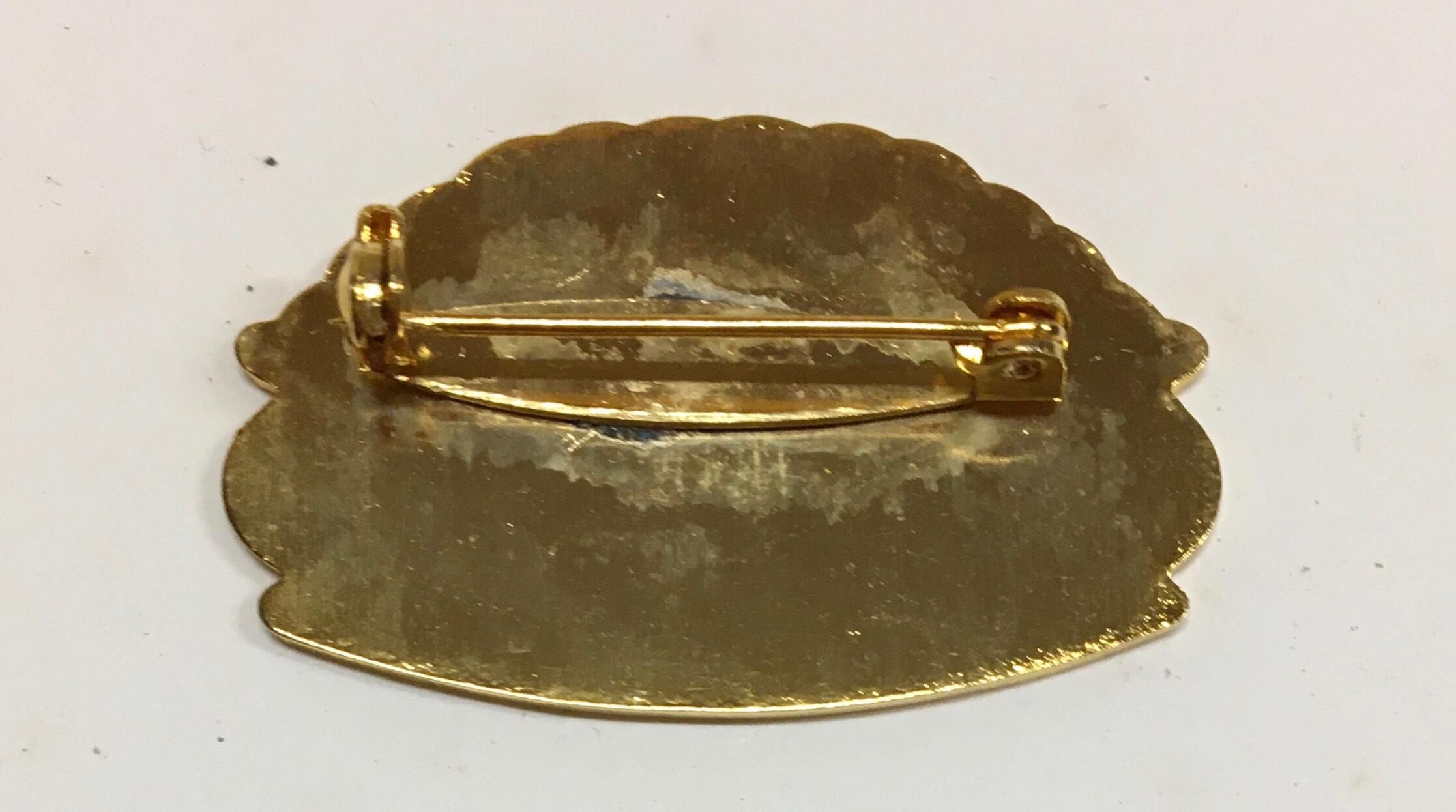 Roughly oval shaped pin with scalloped top edge, gold color edges. Design shows white sky, two navy blue dolphins tail to tail, crossed oars and two lats, bottom half is lighter blue. Text in gold lettering: On top: Est. 1877. On bottom: The Dolphin Club - San Francisco.Use