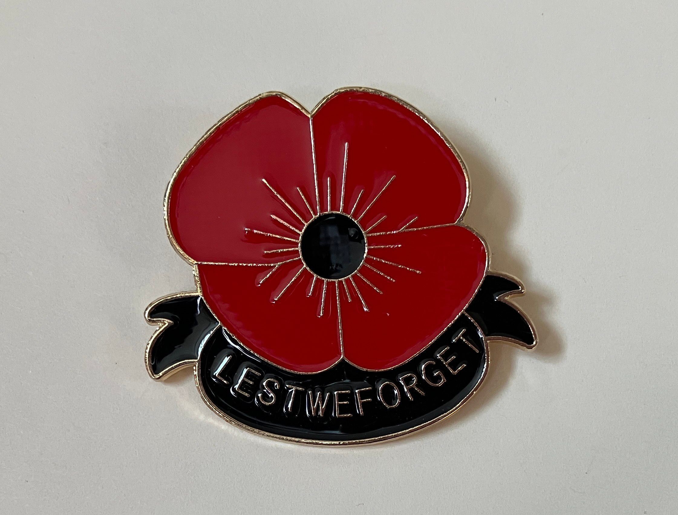 Pin given to participants in first Veteran's Day swim on November 11, 2023. Red poppy with black center. "Ribbon" draped on bottom with text Lest We Forget.