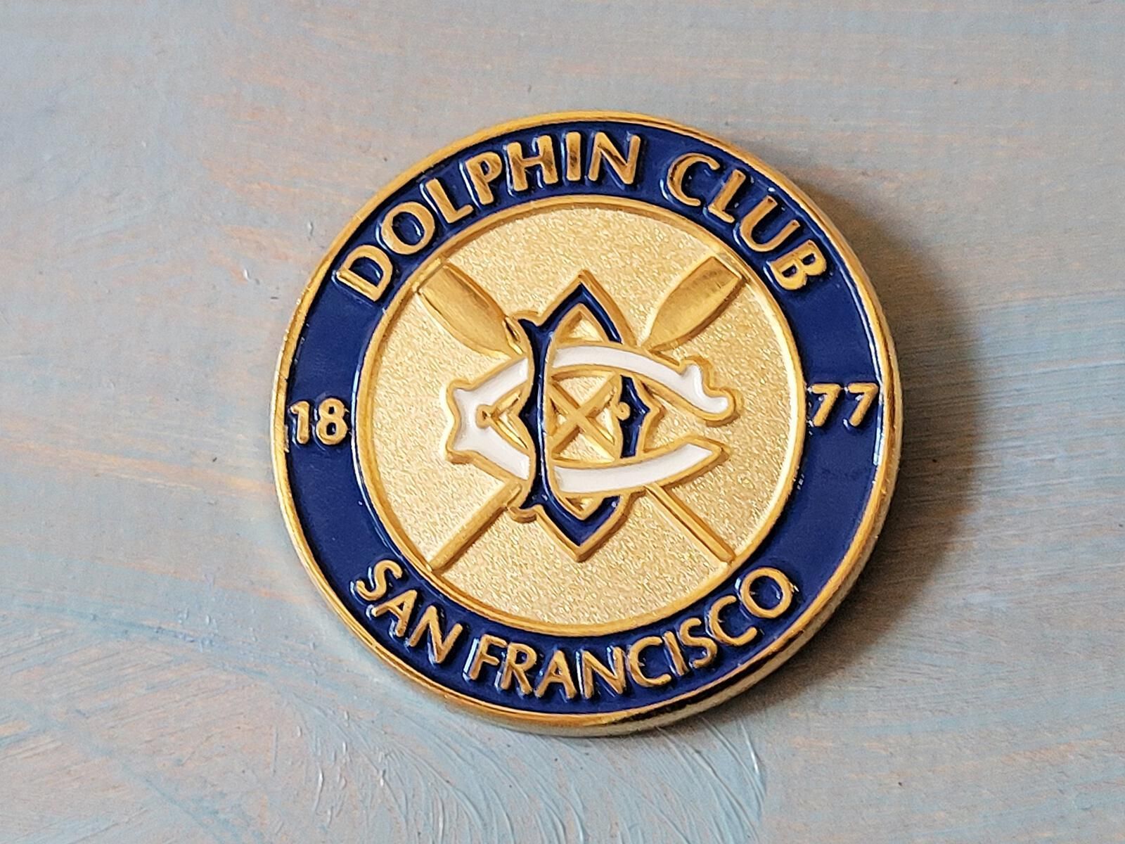 Dolphin Club pin, gold edged blue border with words Dolphin Club on top, San Francisco on bottom, 18 on left and 77 on right border. Gold center area had DC crossed oars logo with blue D, white C, and gold oars.Use