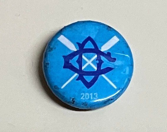Round light blue pin with crossed oars logo in center. Oars are white. D and C are dark blue. Lighter blue text at bottom: "2013"