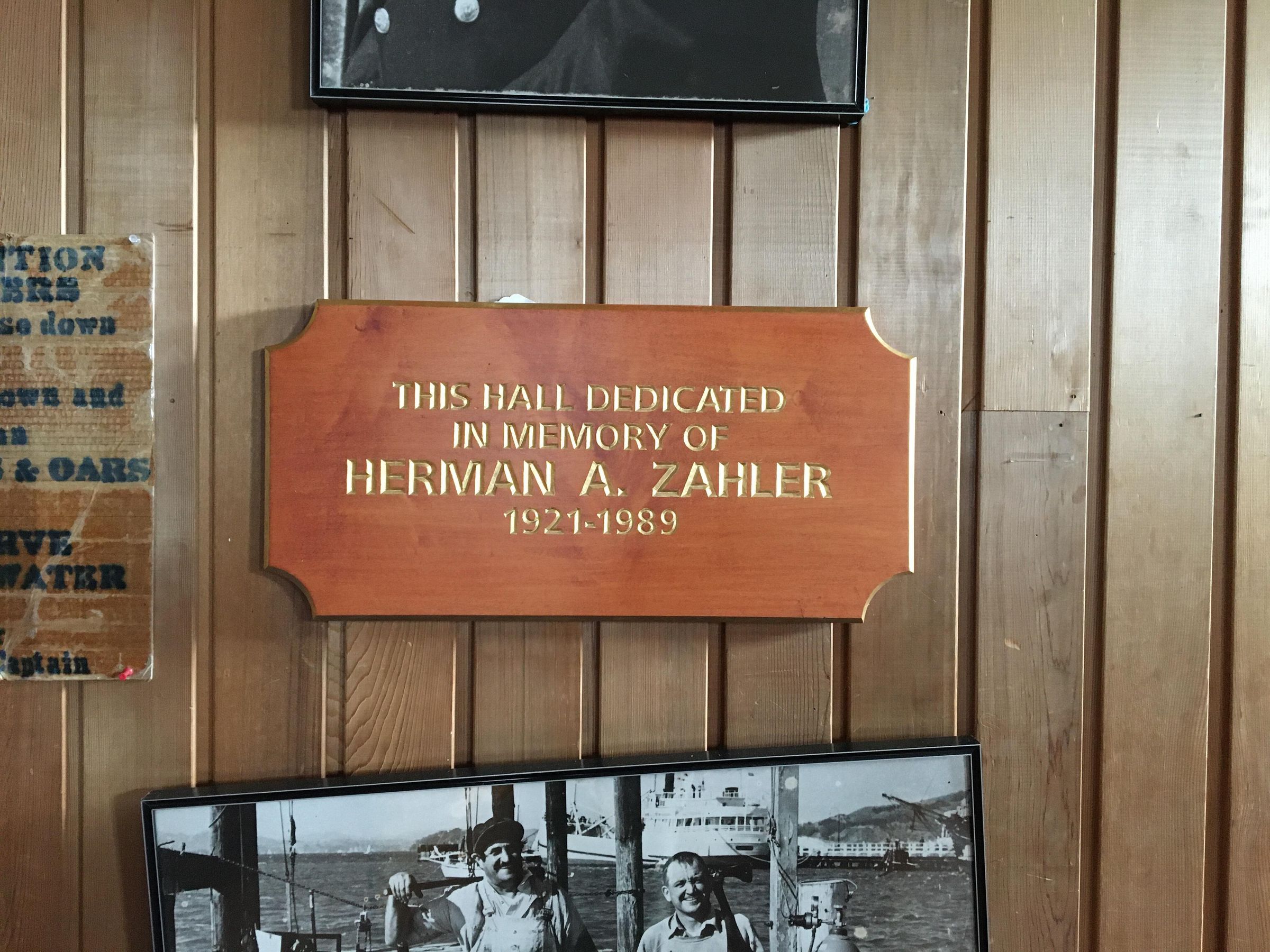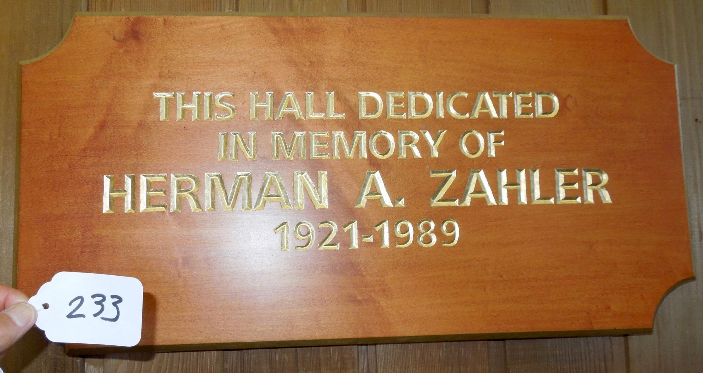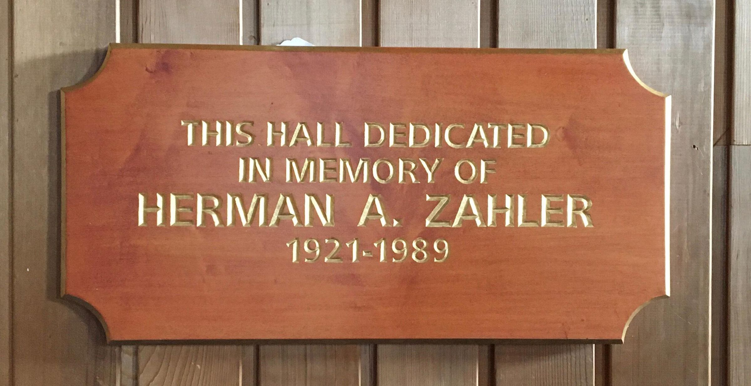 Brown wood rectangular plaque with corners cut out, with gilded words engraved: "This Hall Dedicated - in Memory of -Herman A. Zahler - 1921-1989"Made/Created