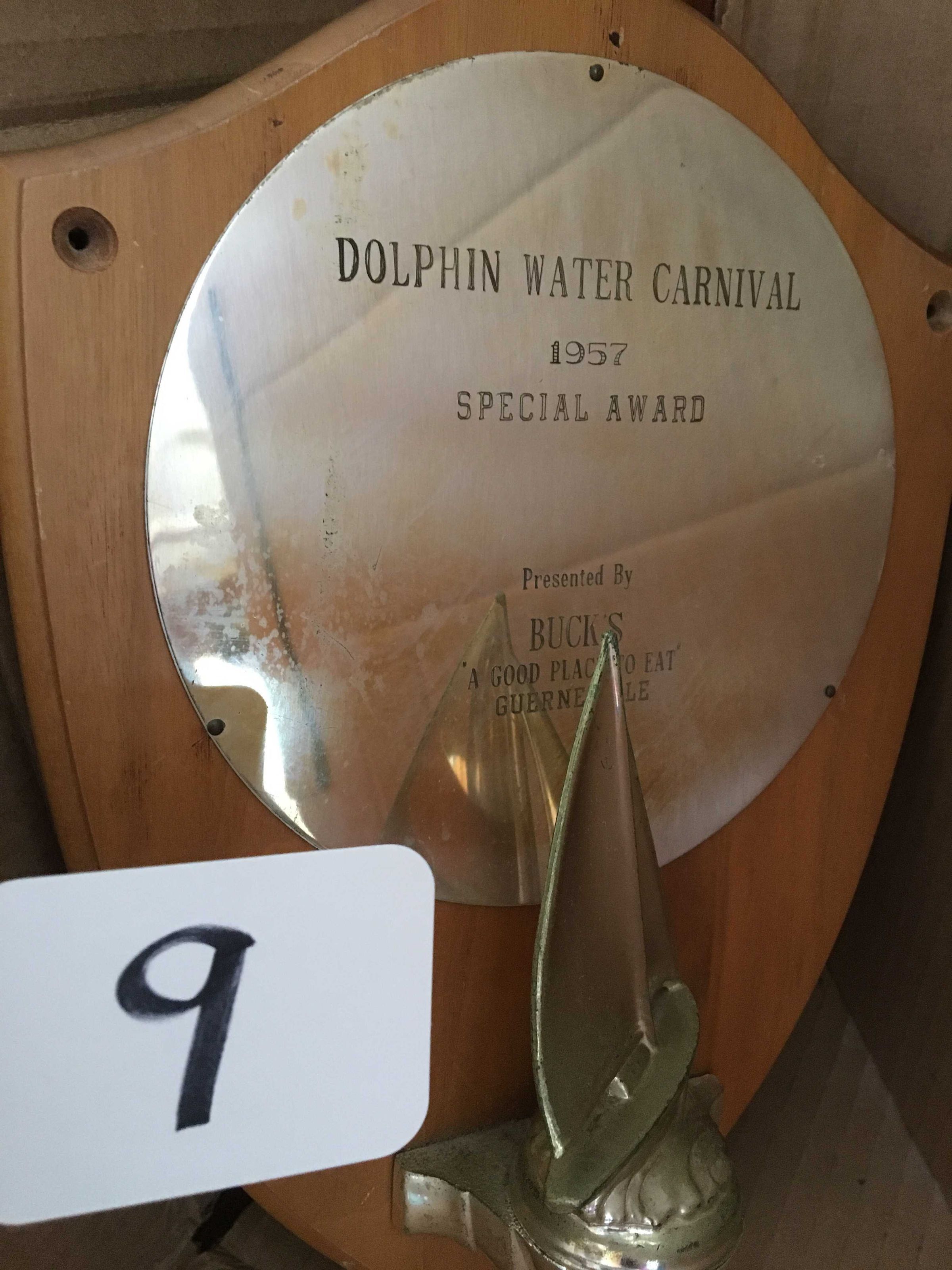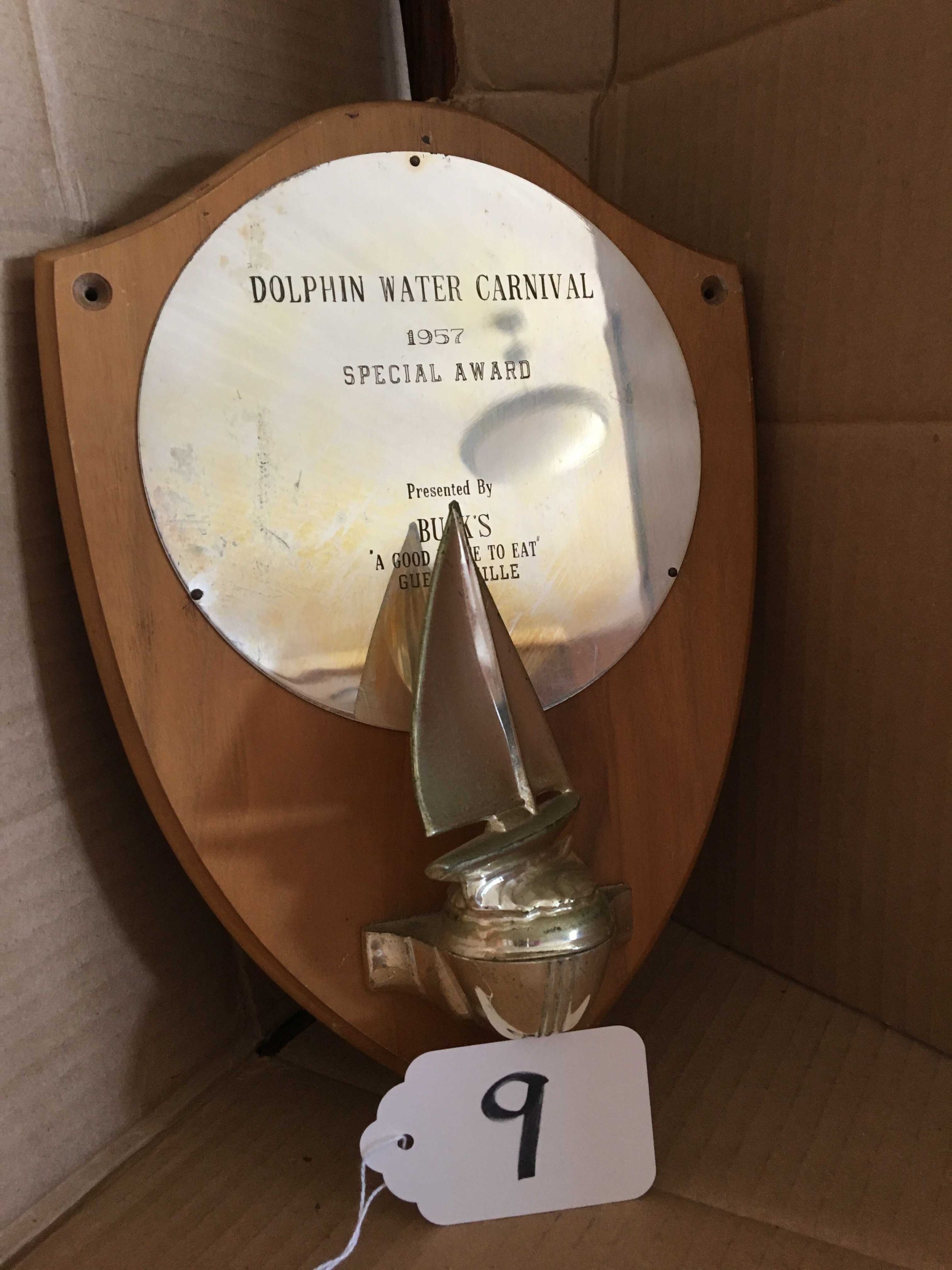Shield shaped wooden plaque with round gold colored metal plate on front; gold colored sailboat attached to bottom of plaque, extending up in front of metal plate; Inscription: "Dolphin Water Carnival - 1957 - Special Award - presnted by Buck's 'A good Place to Eat' - Guerneville"Made/Created