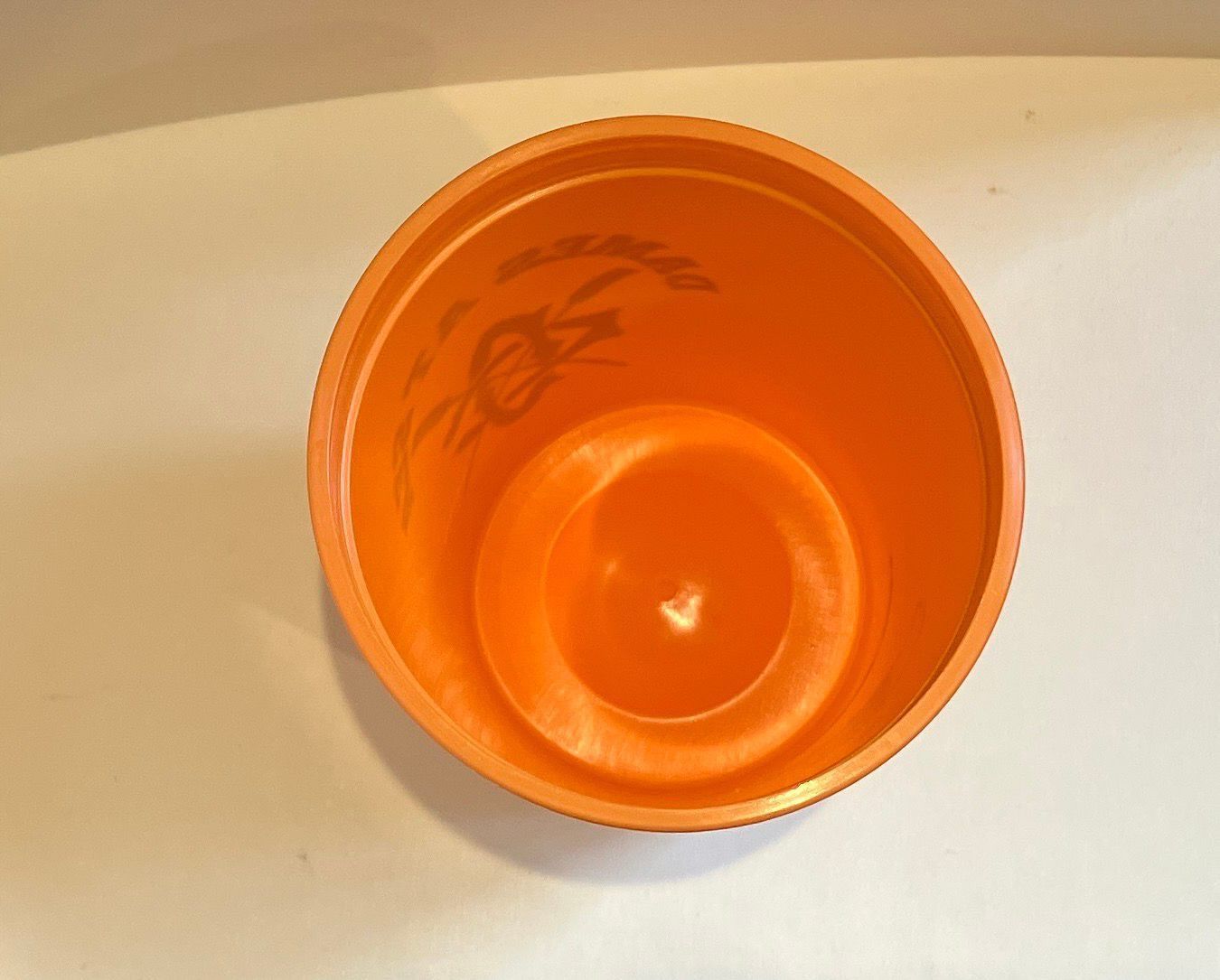 "Dames at Sea" orange plastic cups made for decennial Dolphin Water Ballet performances, coincidentally occurring on Life Member Susan Allen's (joined 1977) big-OH birthdays.