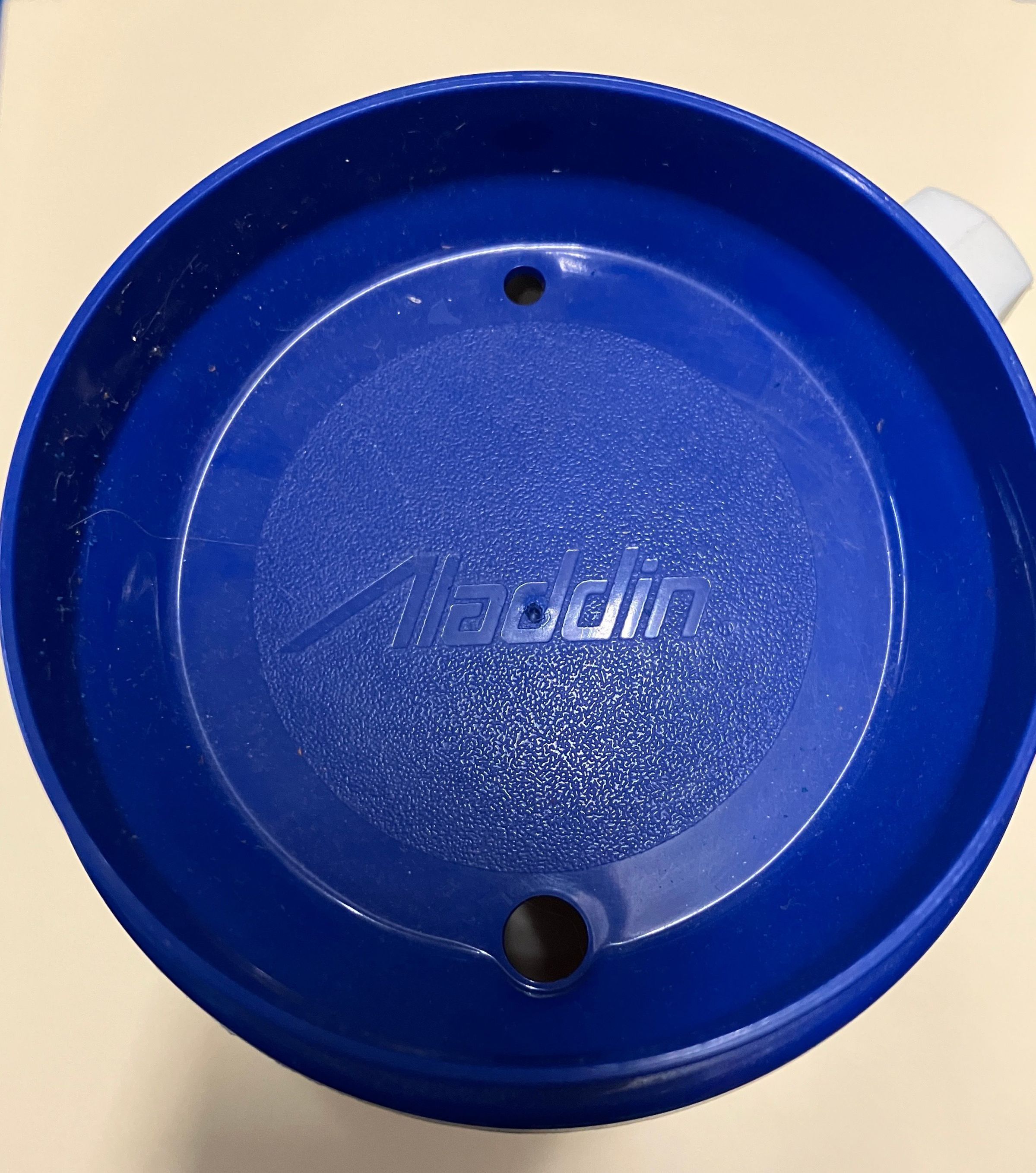 White plastic mug with blue cover and blue print.