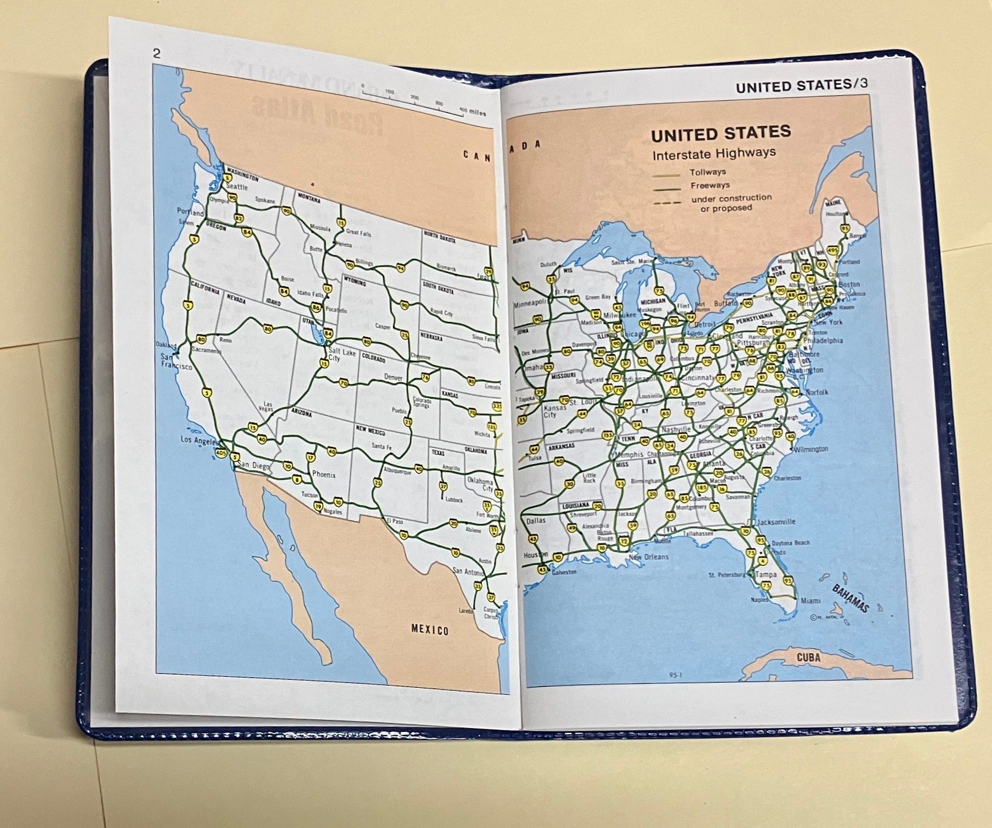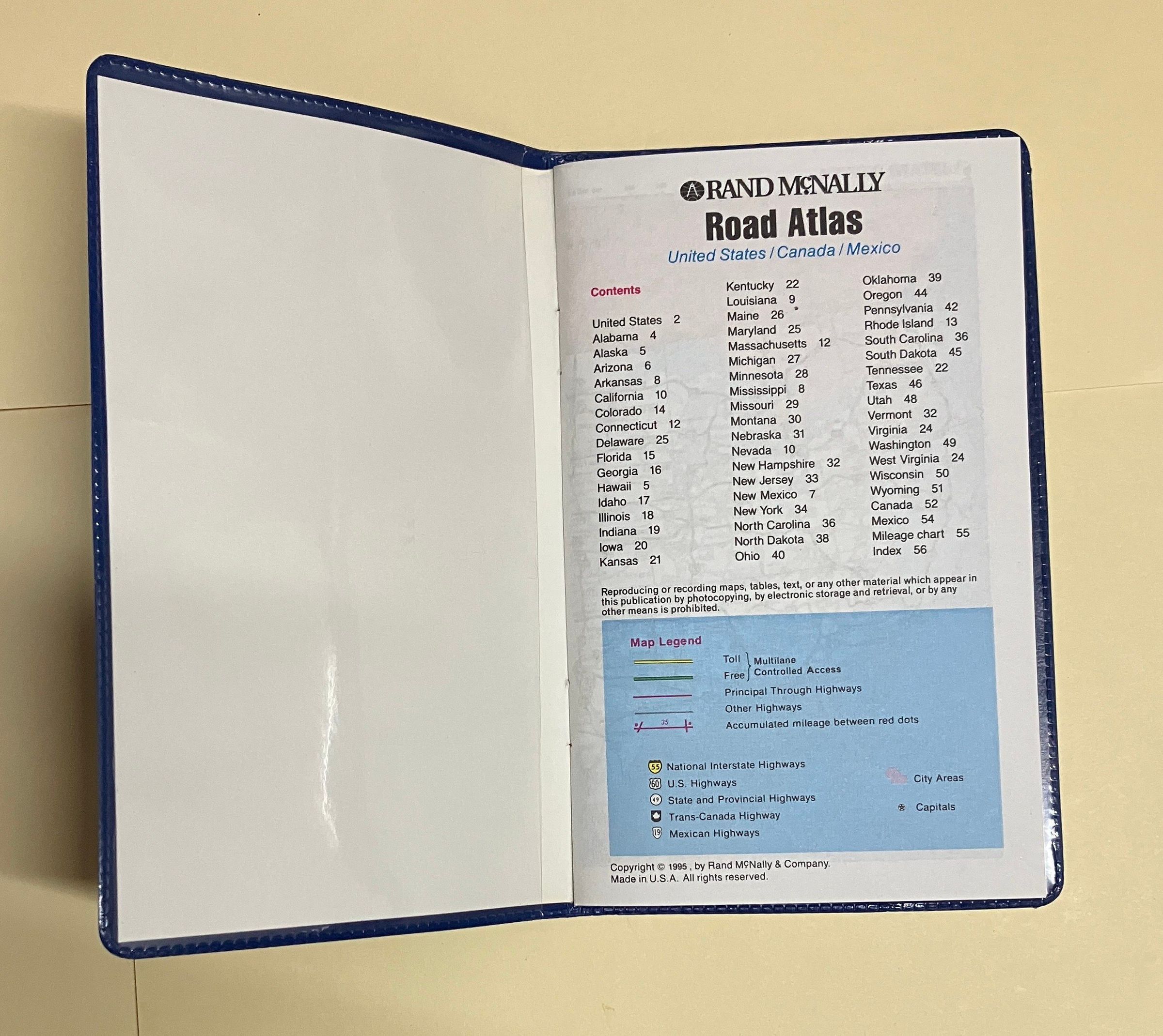 Blue plastic cover with pocket size Rand McNally US/Canada/Mexxico atlas inside.