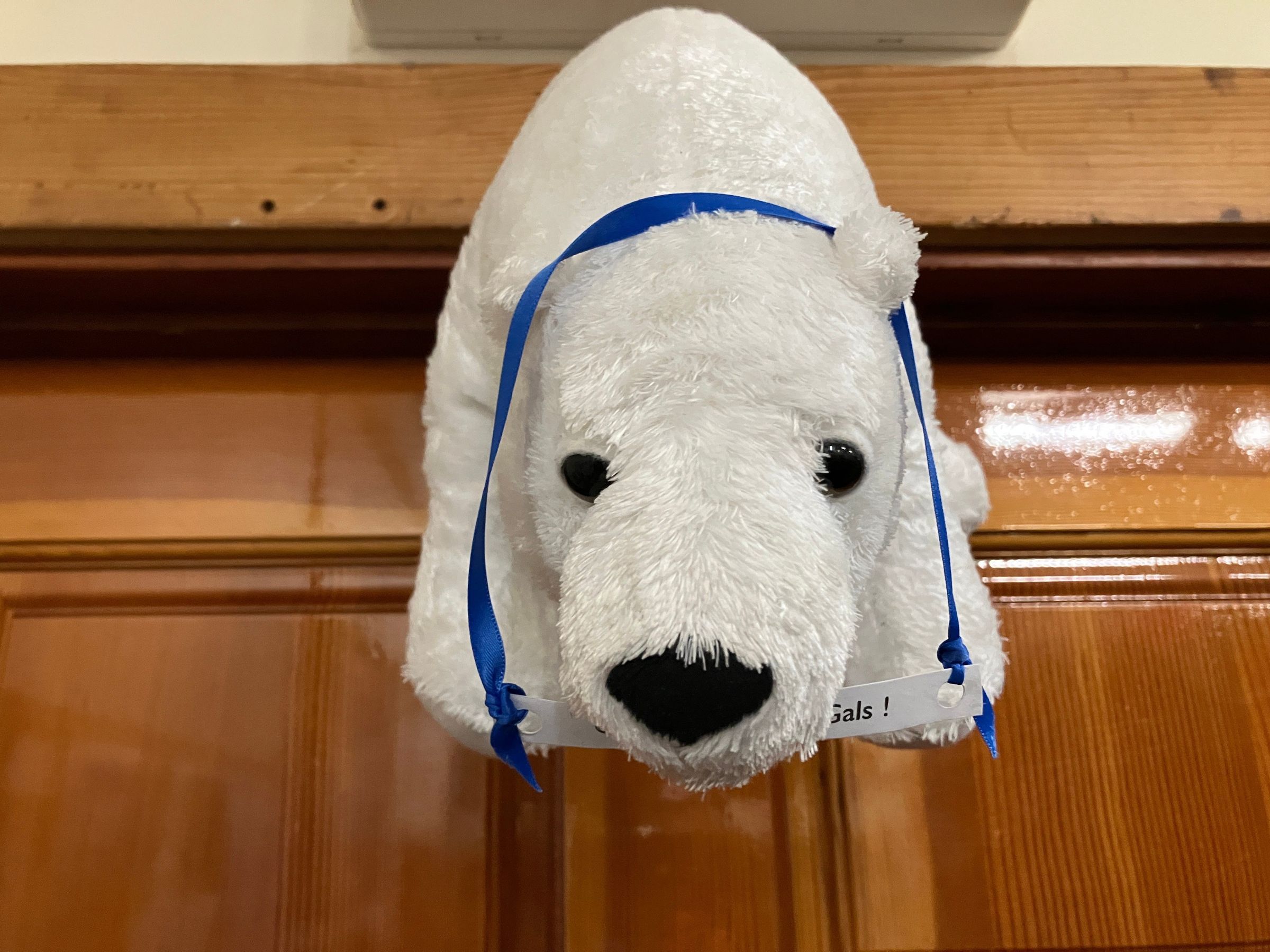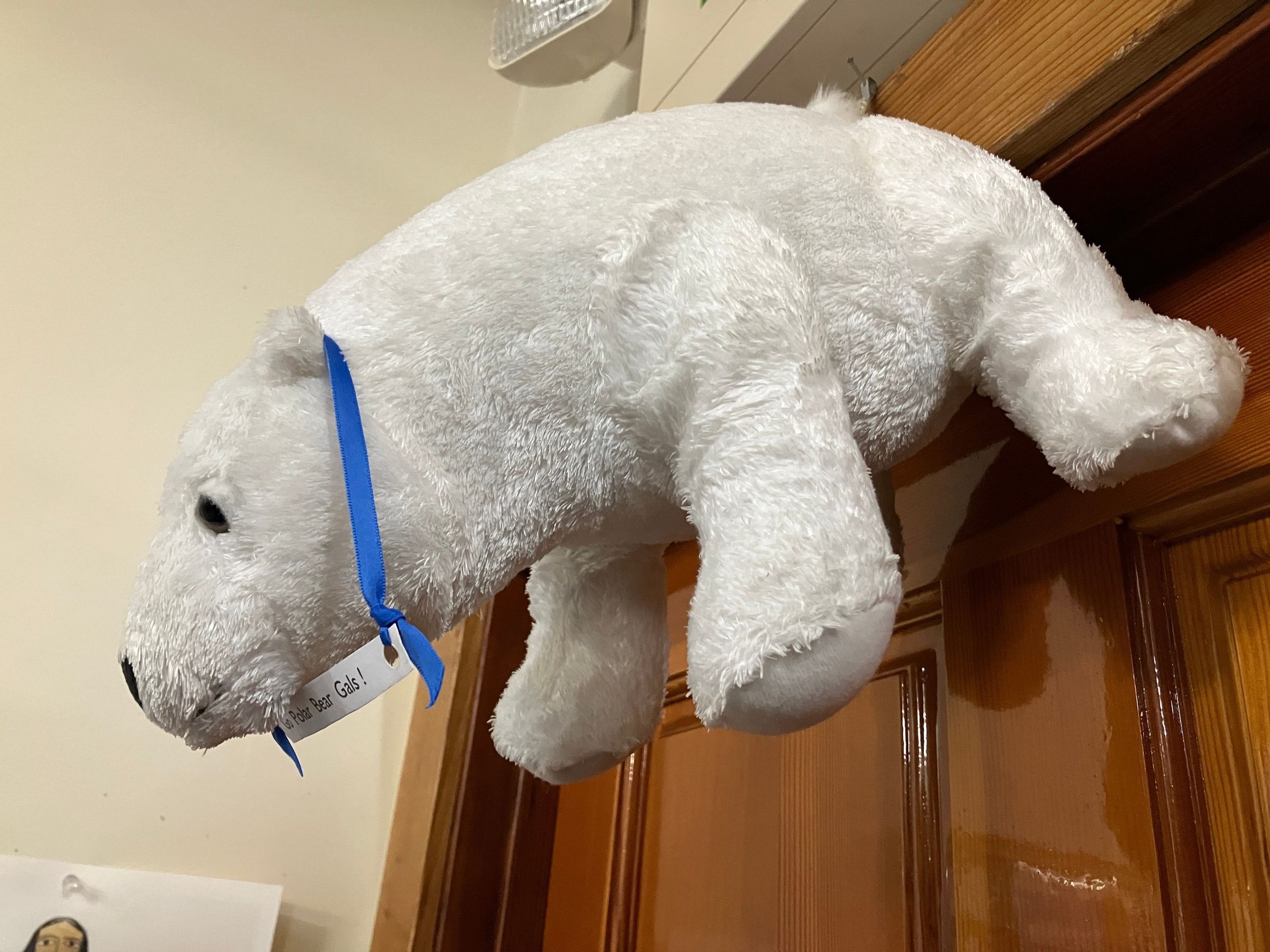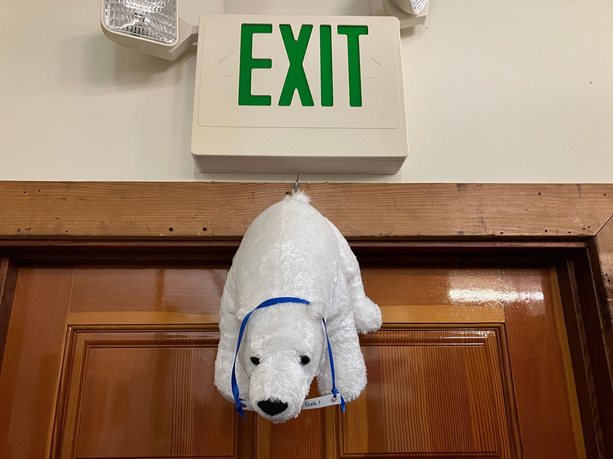 Plush white stuffed animal polar bear. Hanging just inside main door to women's locker room on top door frame center.