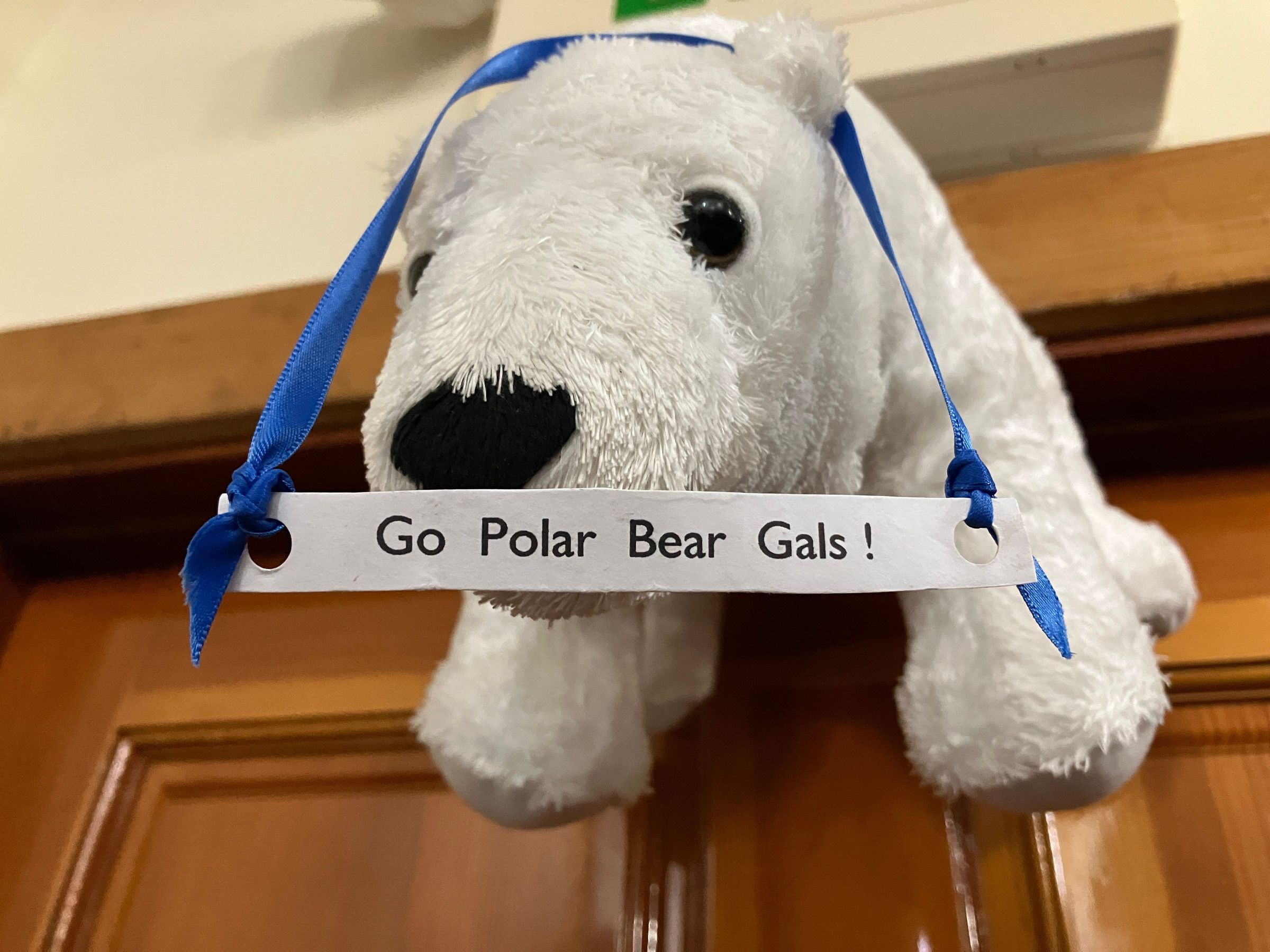 Paper printed sign on neck with blue ribbon: "Go Polar Bear Gals!"Dimensions