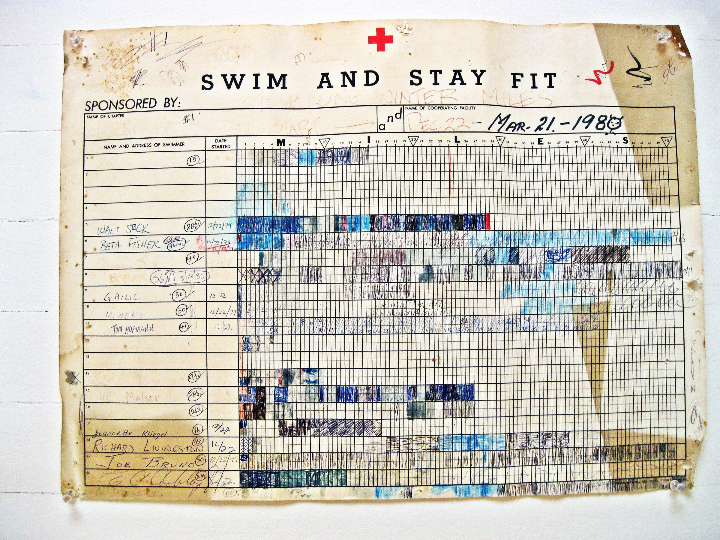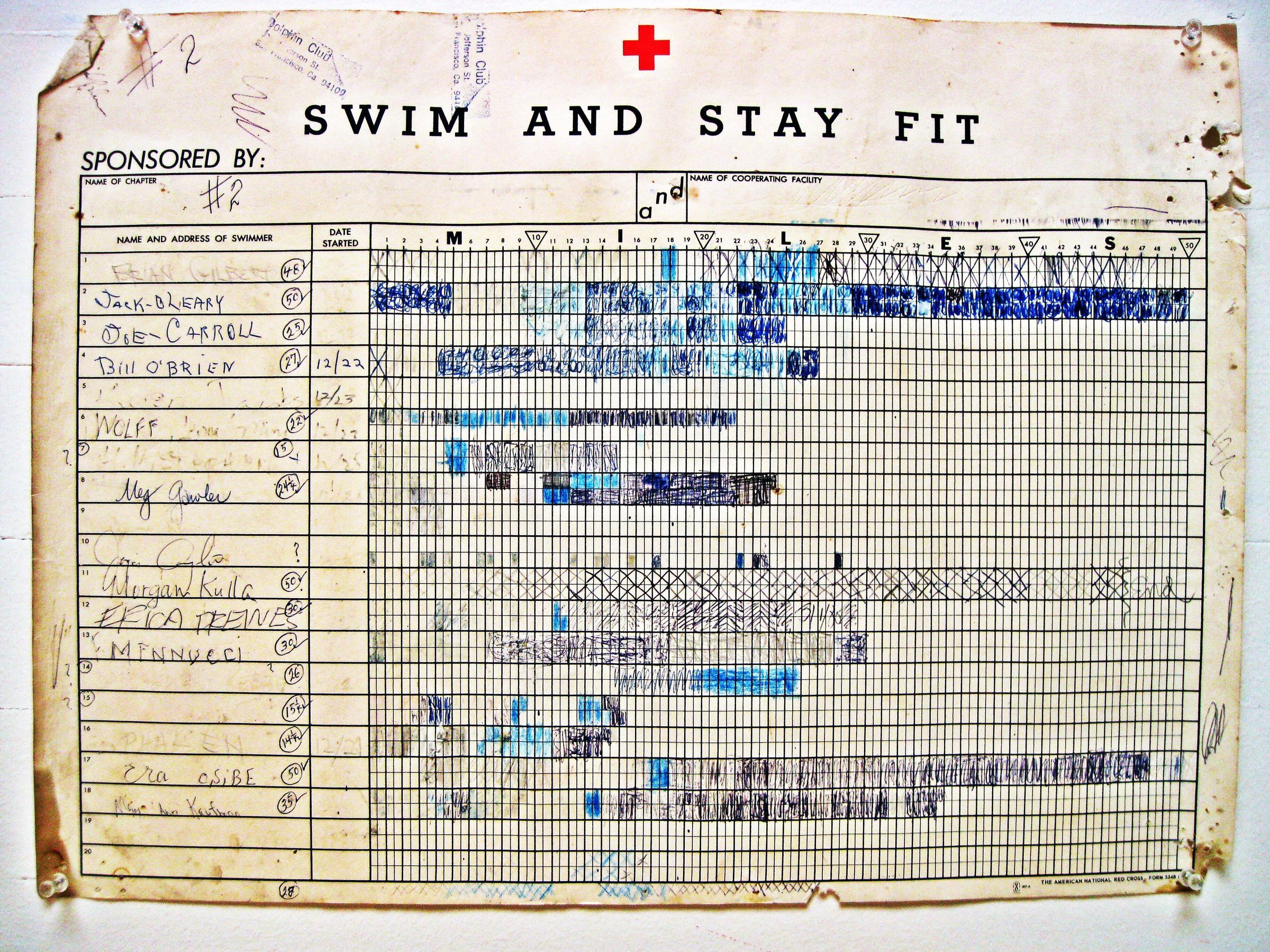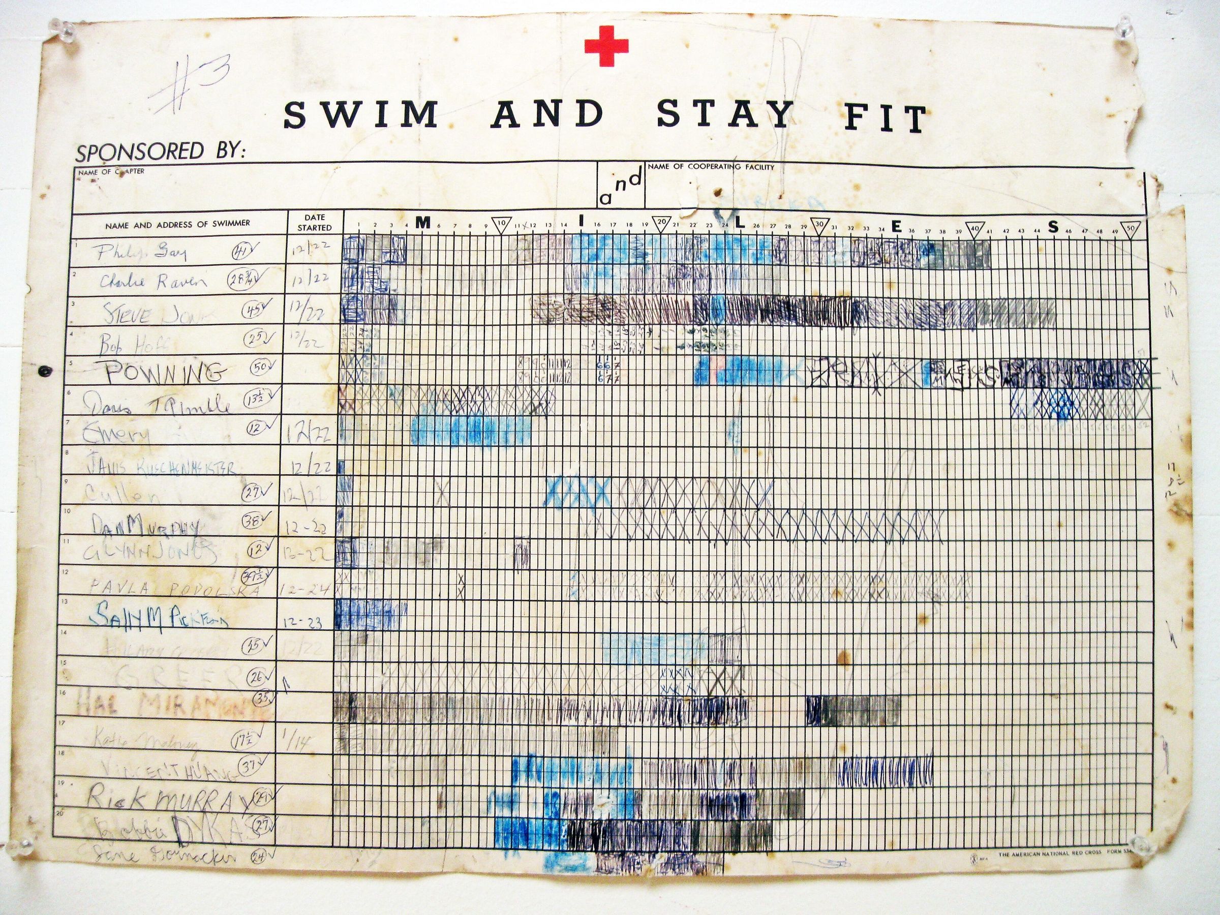 Three pages of Polar Bear charts winter 1980-1981 on which individual members filled in their "squares" for distance they swam between Dec 21, 1979 and March 31, 1980.Location