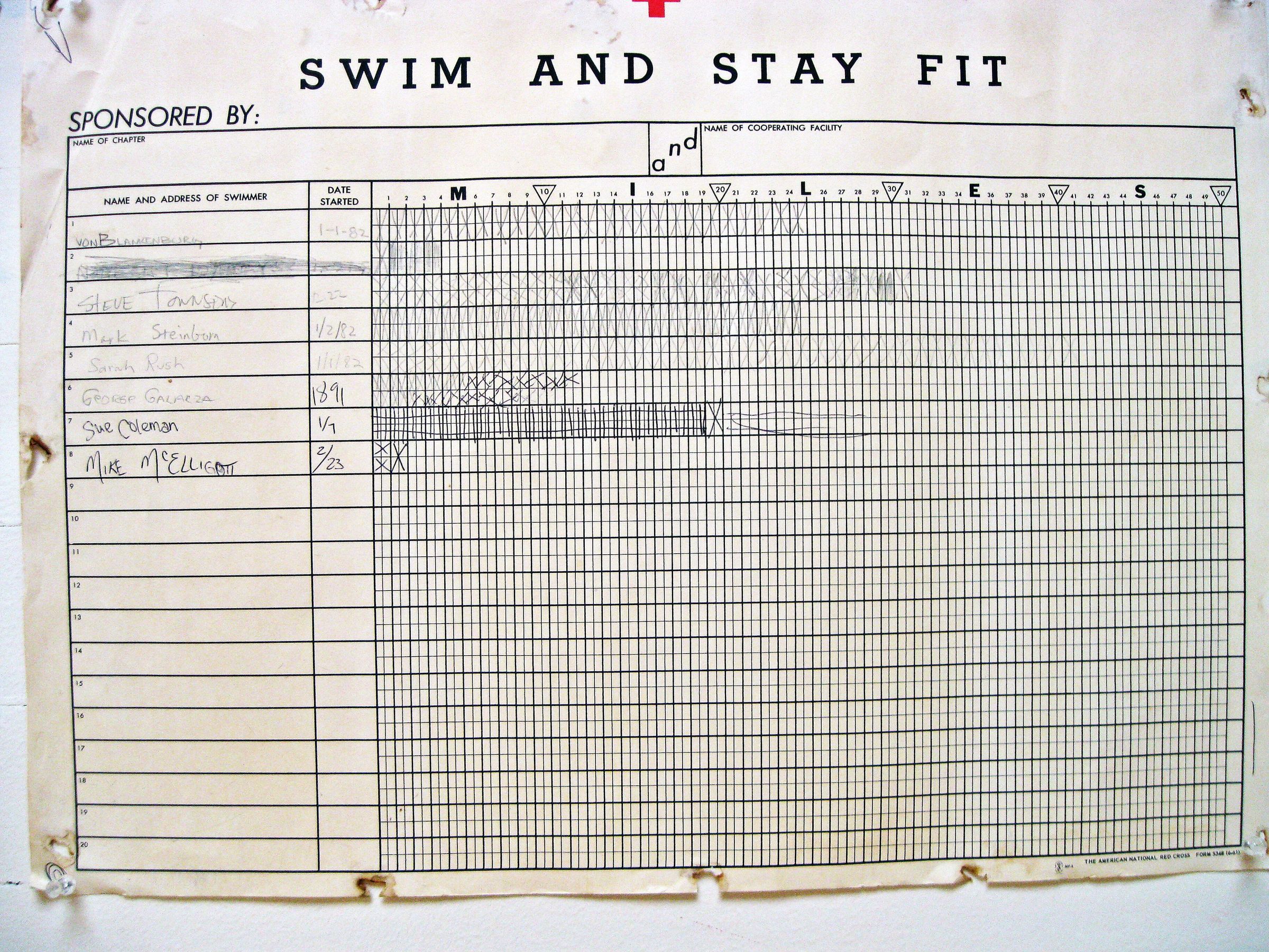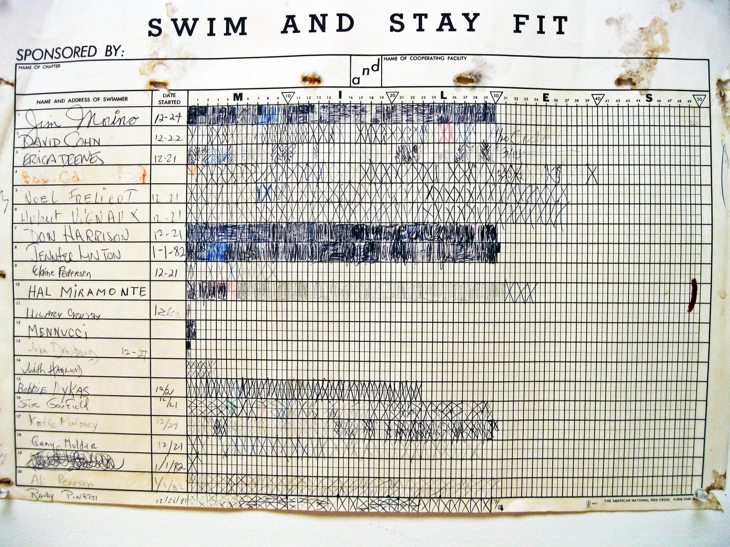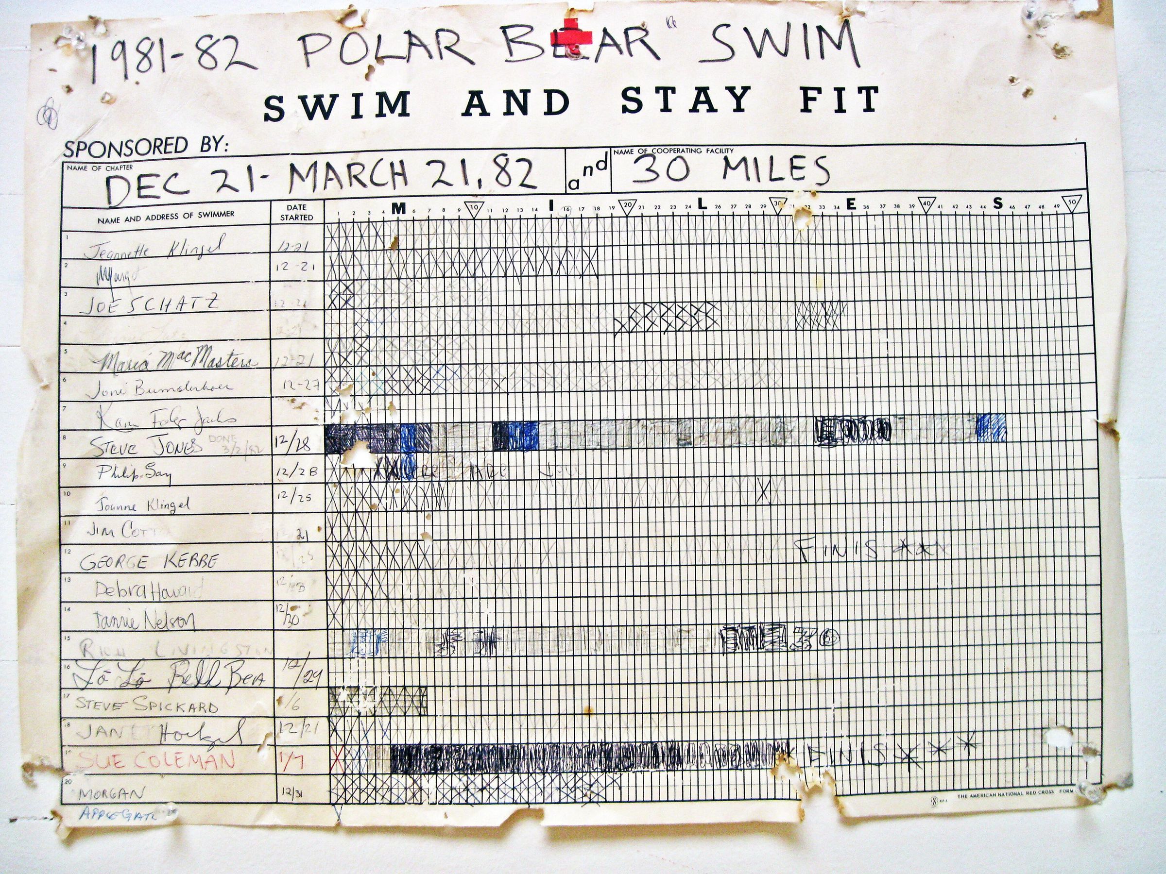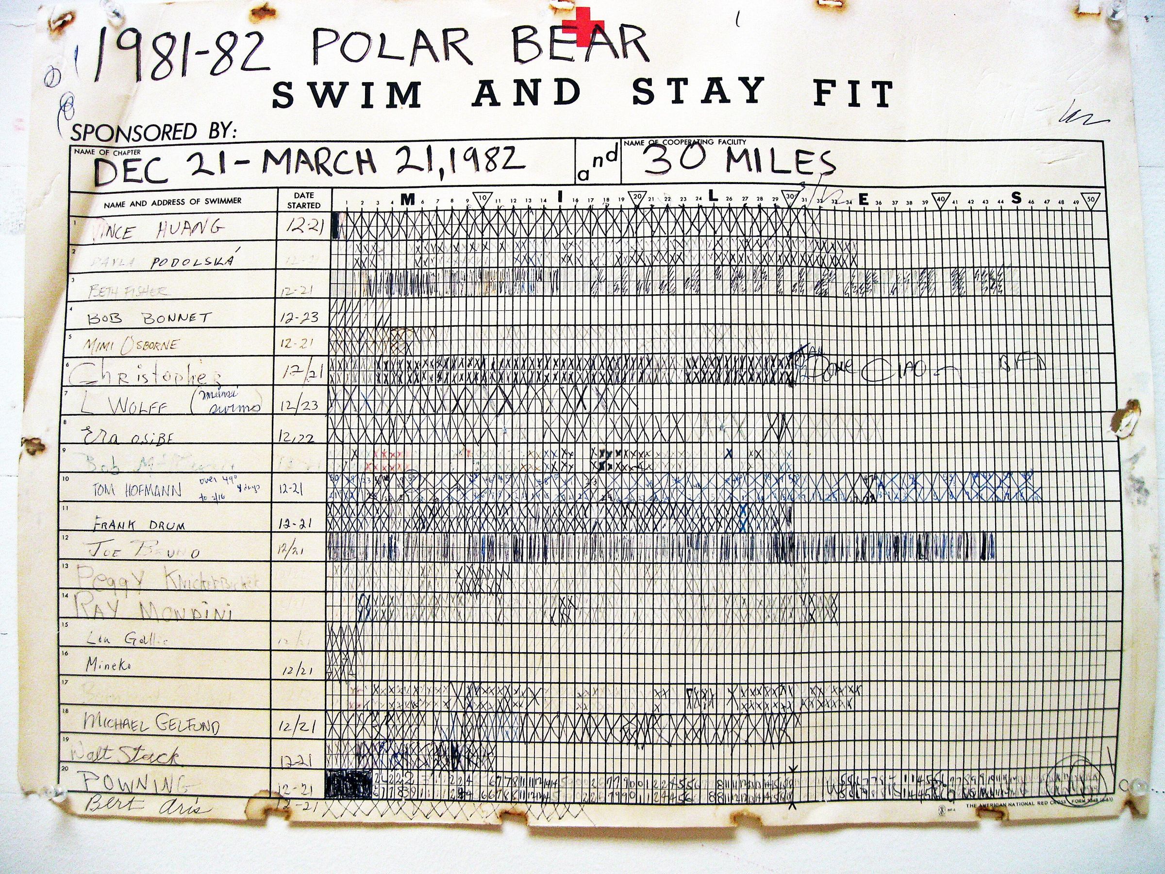 Four pages of Polar Bear charts winter 1982-1983 on which individual members filled in their "squares" for distance they swam between December 21, 1982 and March 31, 1983.Location