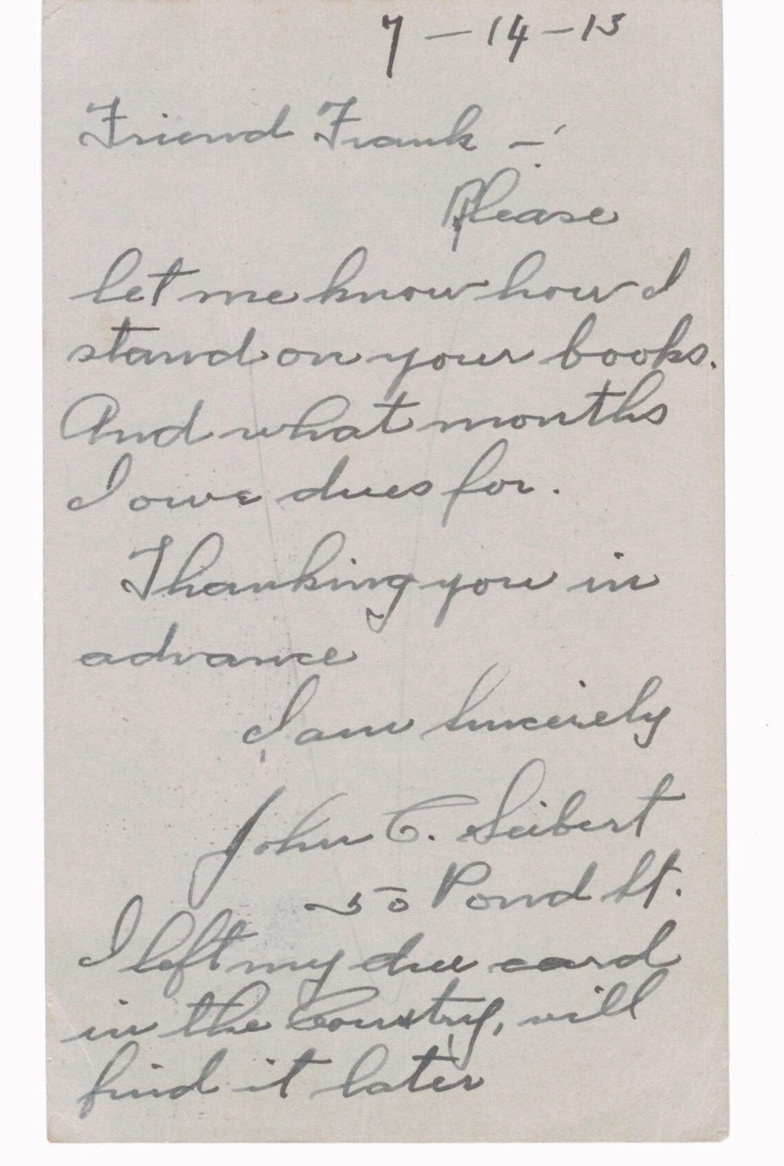 Hand-written message on back of postcard from member John C Seibert to "Friend Frank" (Staib) regarding his dues payment and misplaced membership card.