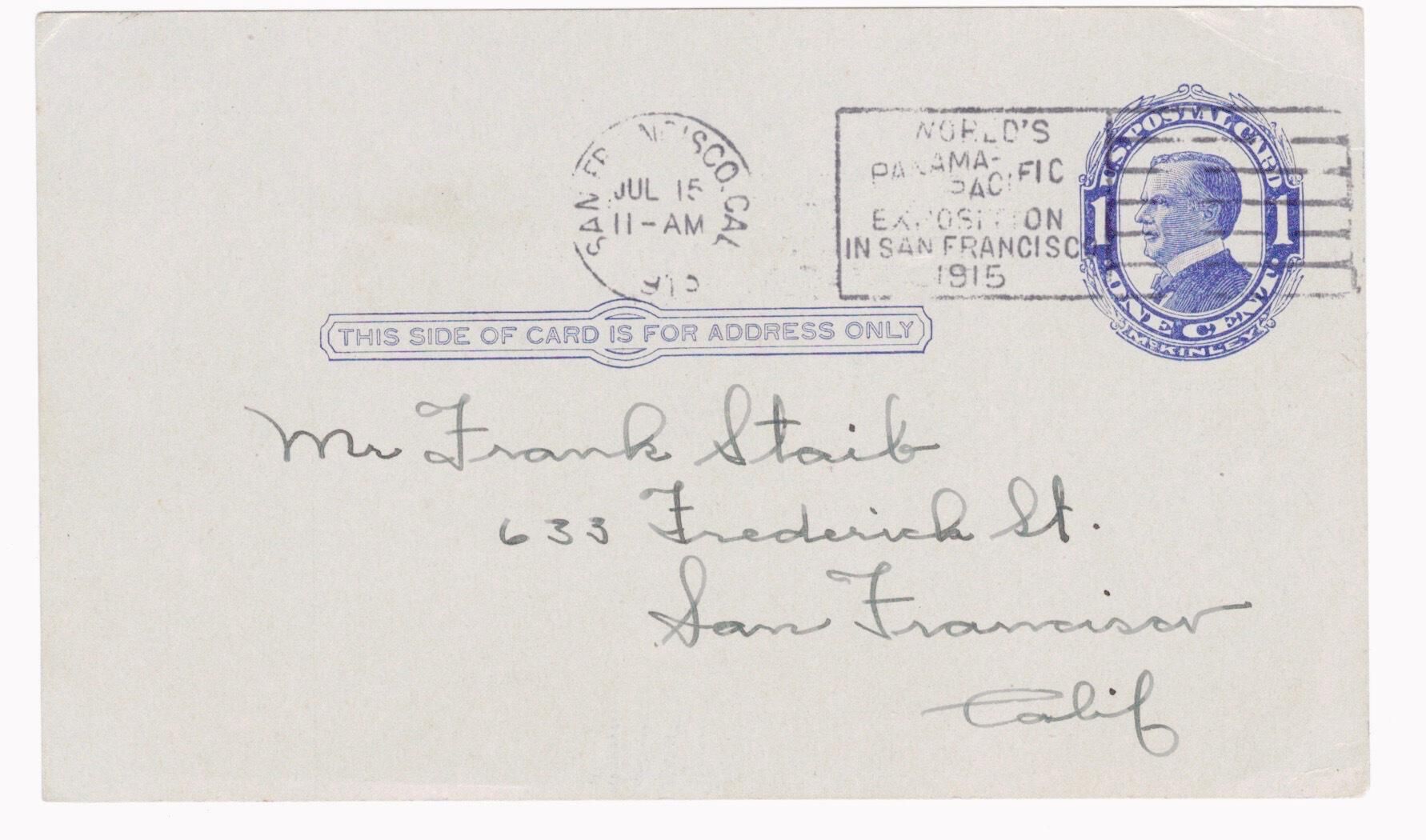 Addressed to Mr. Frank Staib, 633 Frederick St, San Francisco, Calif.Archive Items Details