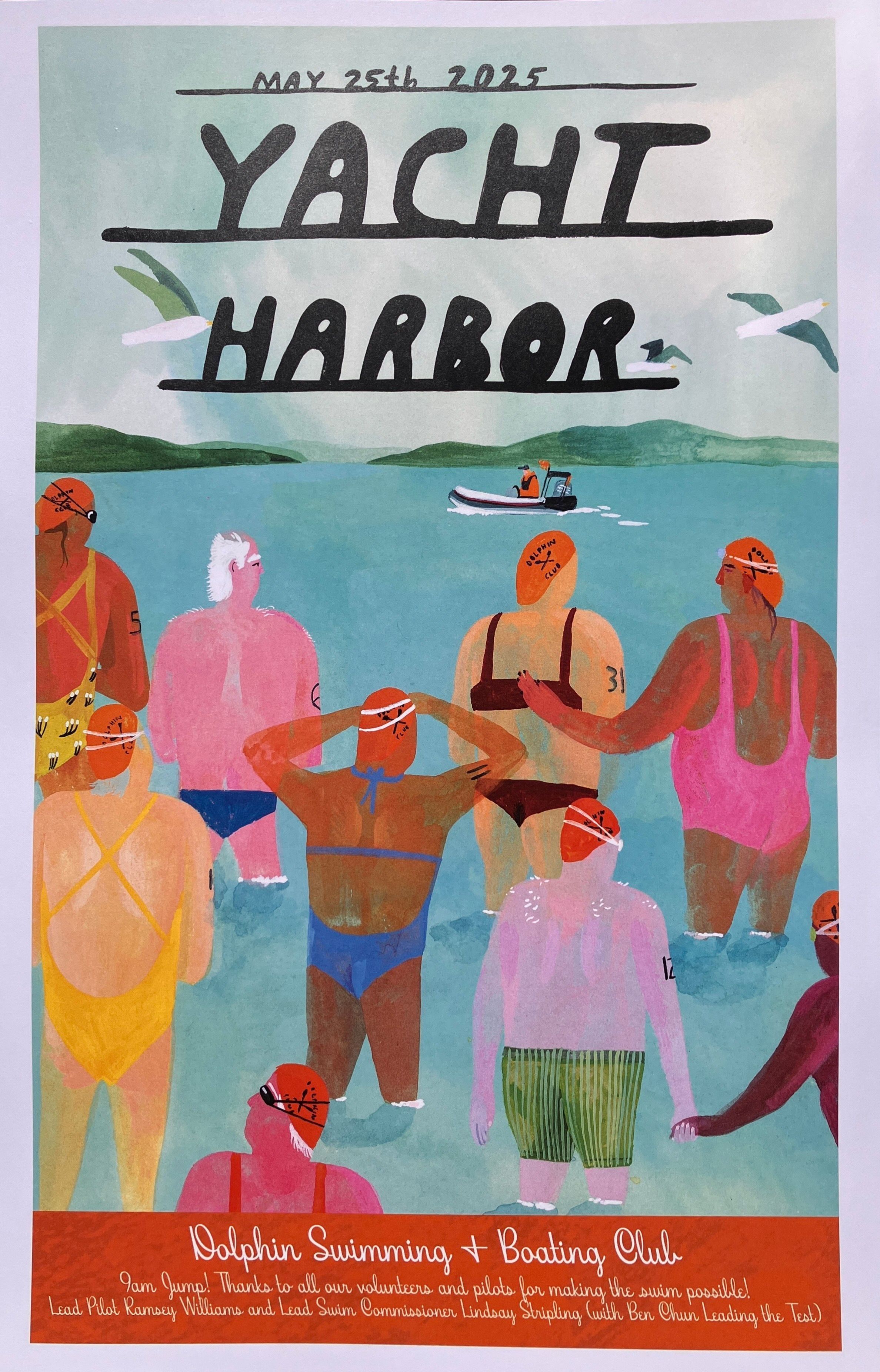 Poster for 2025 yacht Harbor Swim May 25, 2025.
