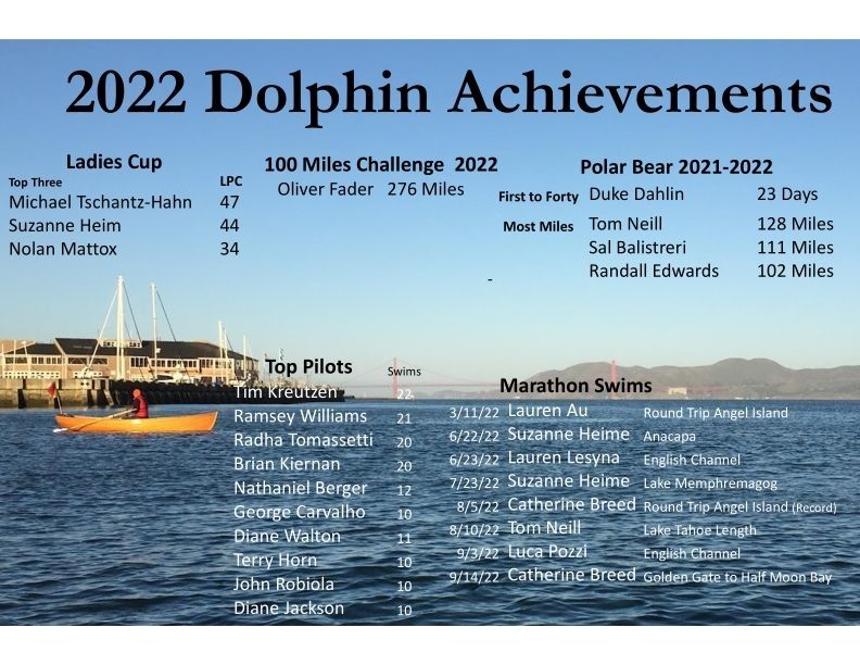 Poster entitled "2022 Dolphin Achievements" featuring photo of a rower with the GG Bridge and Marin in background . Posted on bulletin board east side of entry corridor.