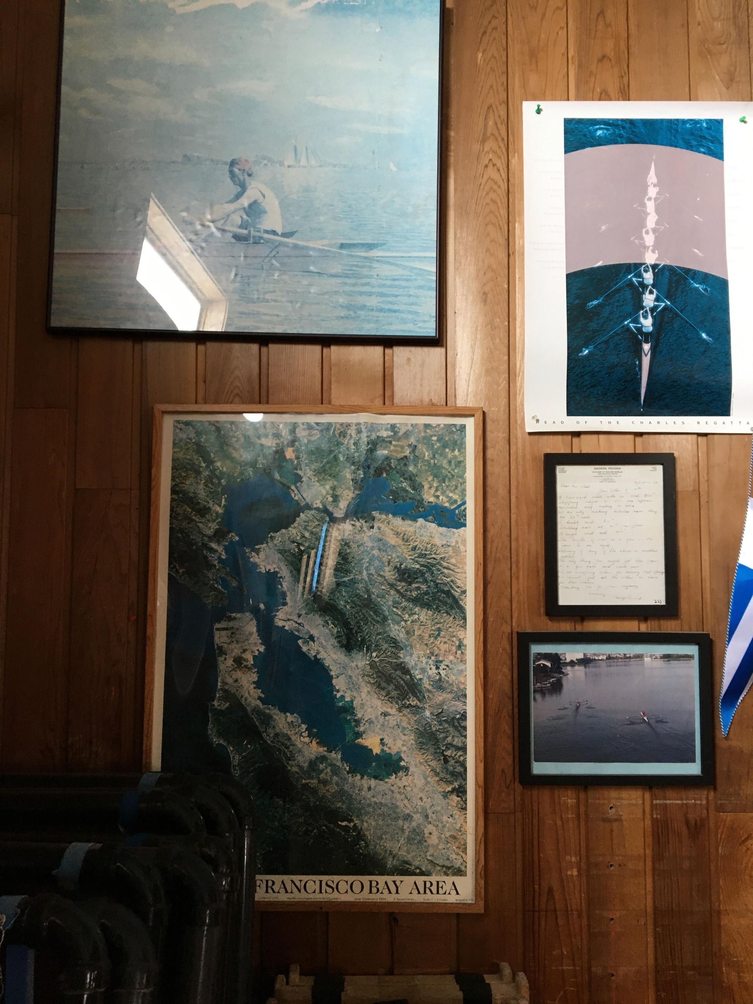 Poster of view of 6 person rowing crew from above, crew mostly white color, water is blue, curved gray band across center; not framed, attached to wall with push pins.