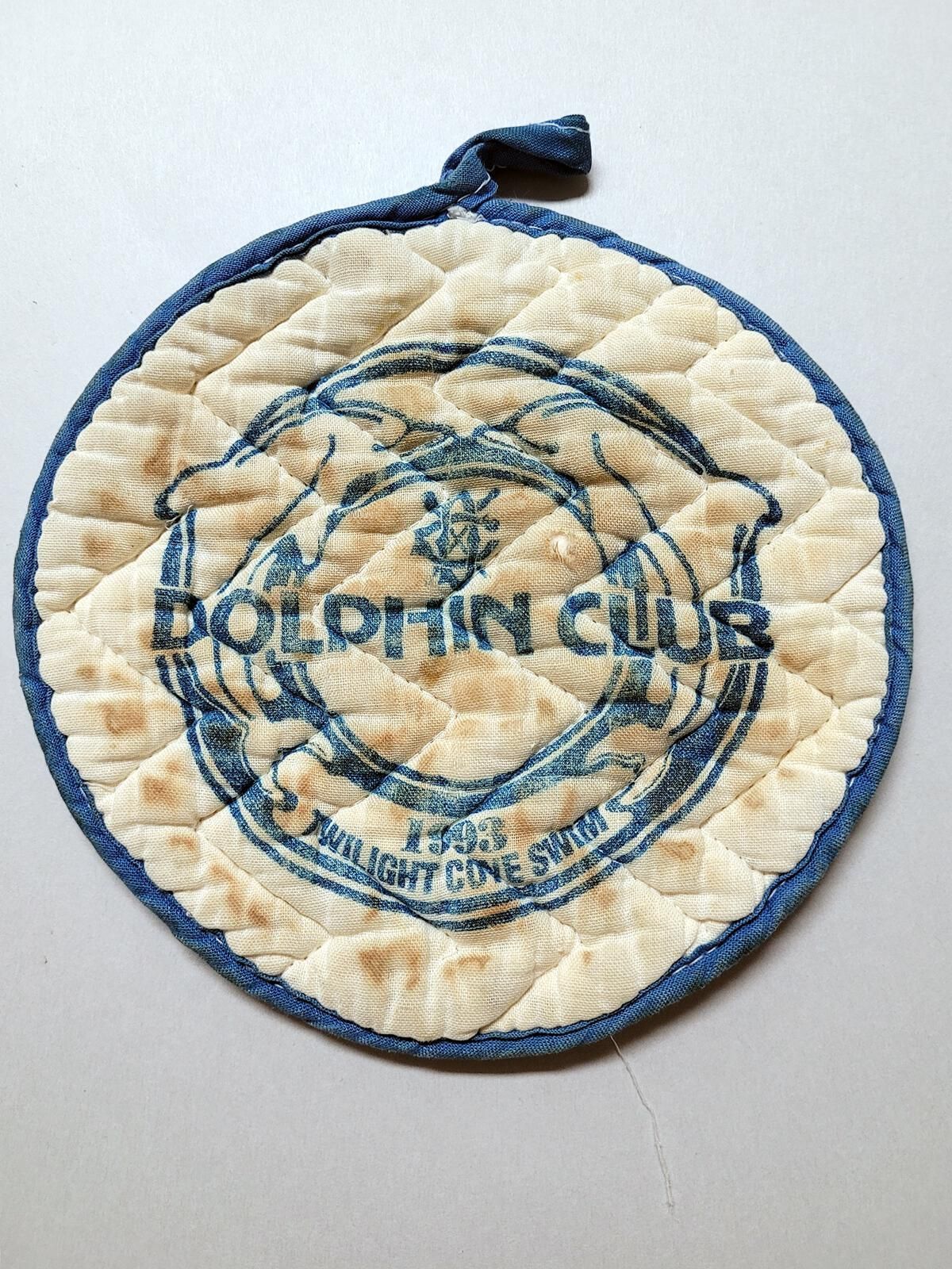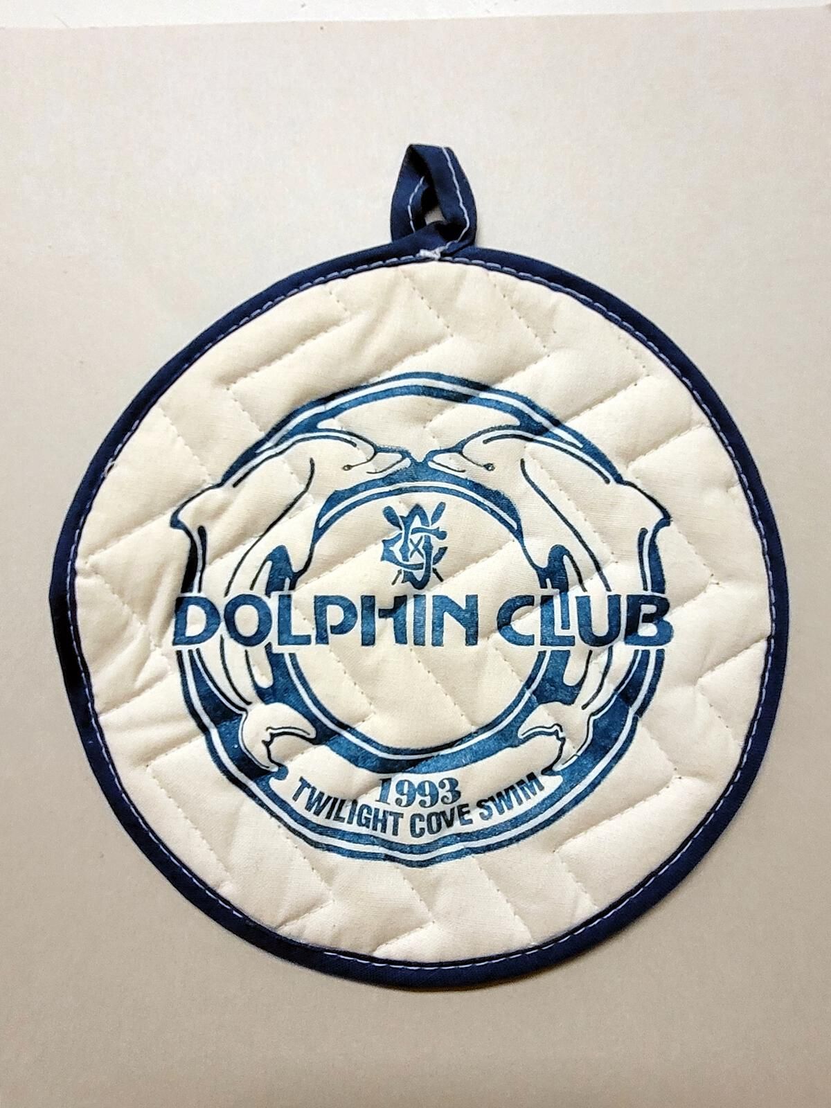 Round potholder with logo of two dolphins, club logo, “Dolphin Club, 1993 Twilight Cove Swim"