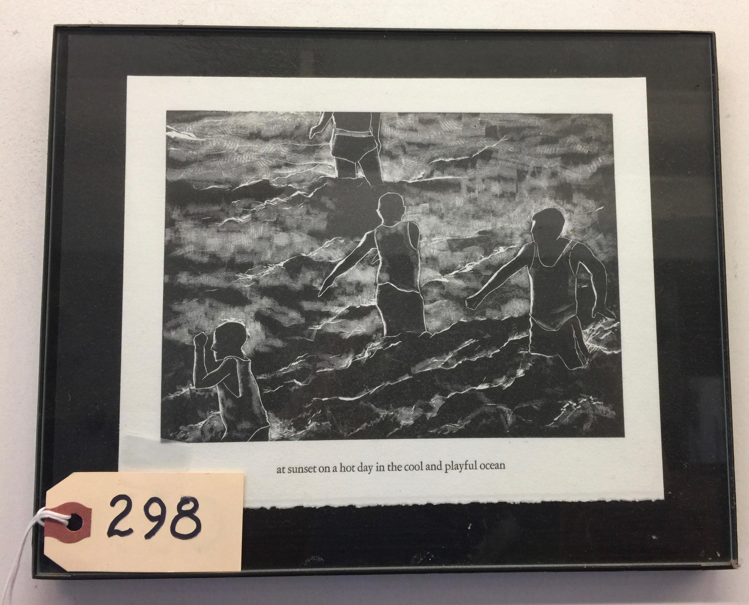 Black and white print in black frame. Four men stand in the water. Typed caption below reads, "at sunset on a hot day in the cool and playful ocean."Made/Created