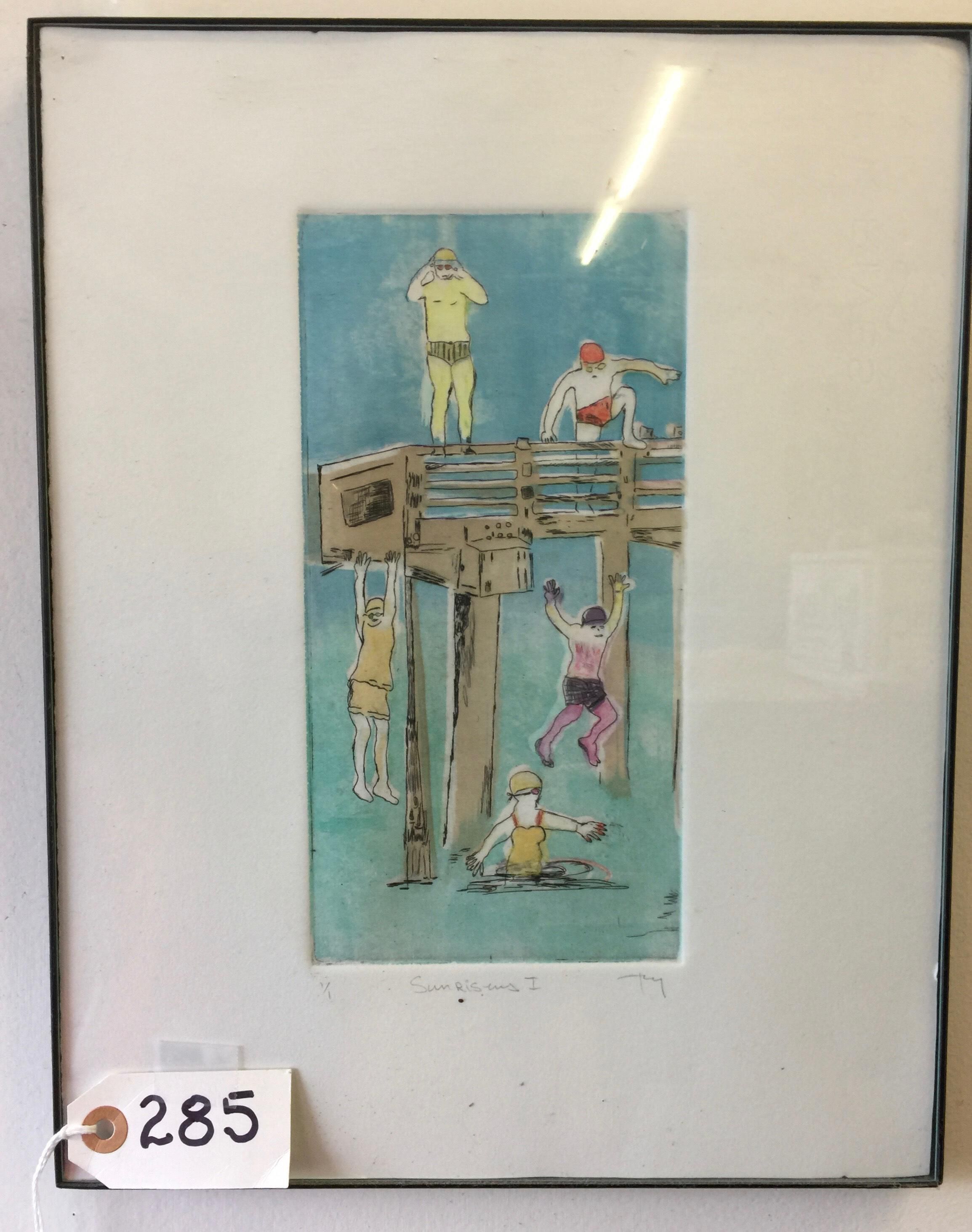 Light blue print showing the end of a tall tan pier, two people on top, one hanging off, one apparently falling toward water, and one in water. In a black metal frame with glass.