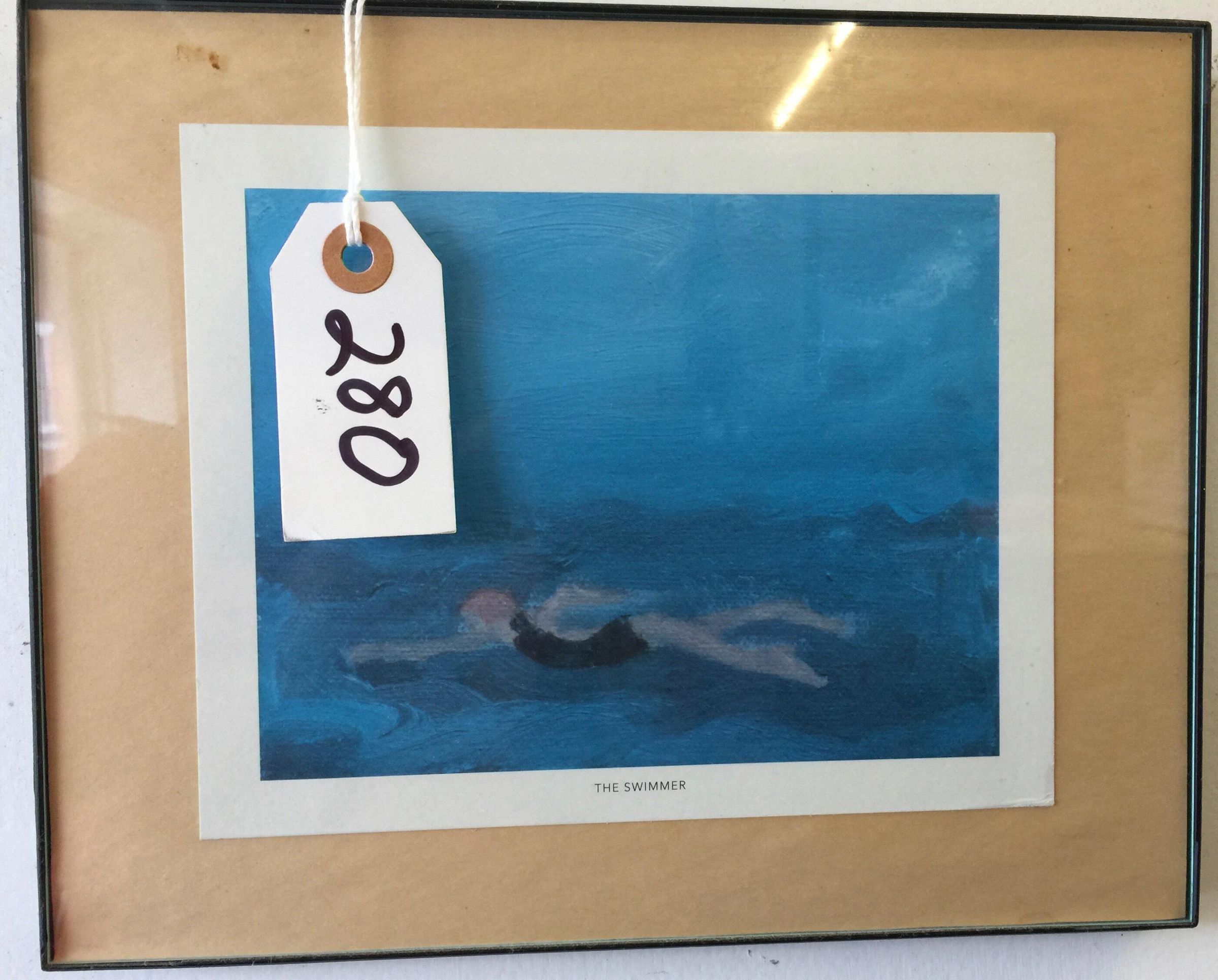 Blue print (not an original) shows woman n black swim suit and orangish color cap swimming horizontally toward left on deep blue color water. Mounted on brown paper in black metal frame.