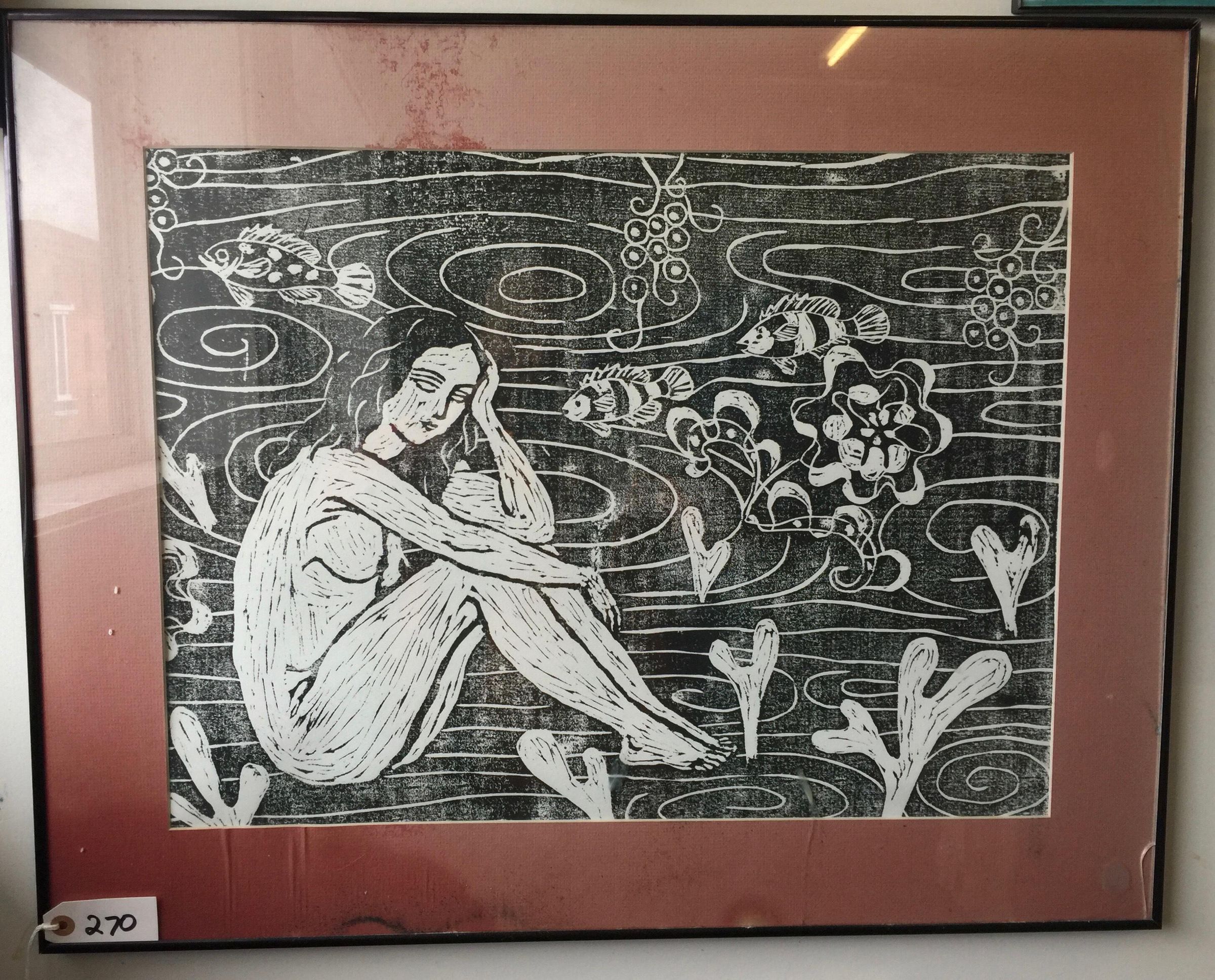 Black and white block print of woman sitting underwater with swirls of current, fish, and plants. Brown mat, black frame, unsigned.Made/Created