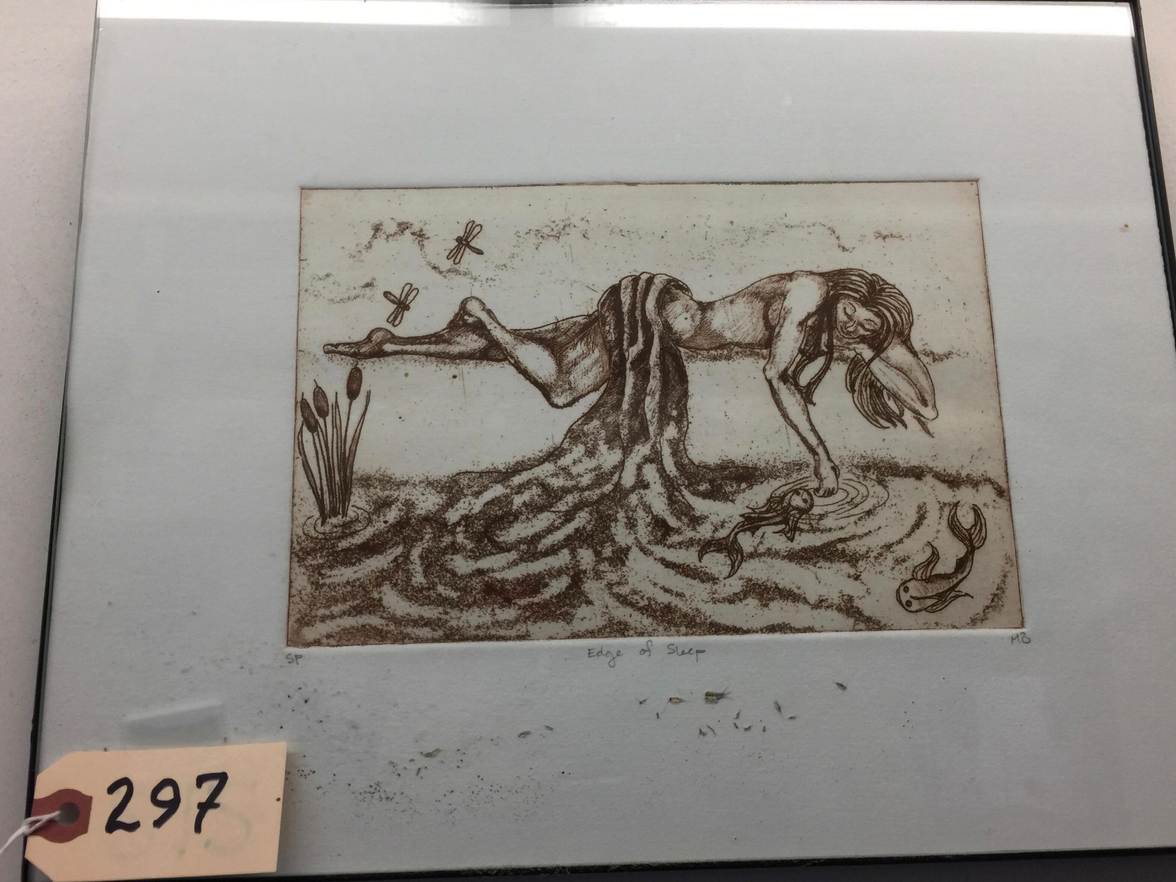 Dark brown lithograph in black frame with glass. Shows human figure partially clad in cloth, lying horizontally above water, dipping one hand into it and looking down. The water reaches up to become part of cloth on figure. Written along bottom of print on white mat left to right: