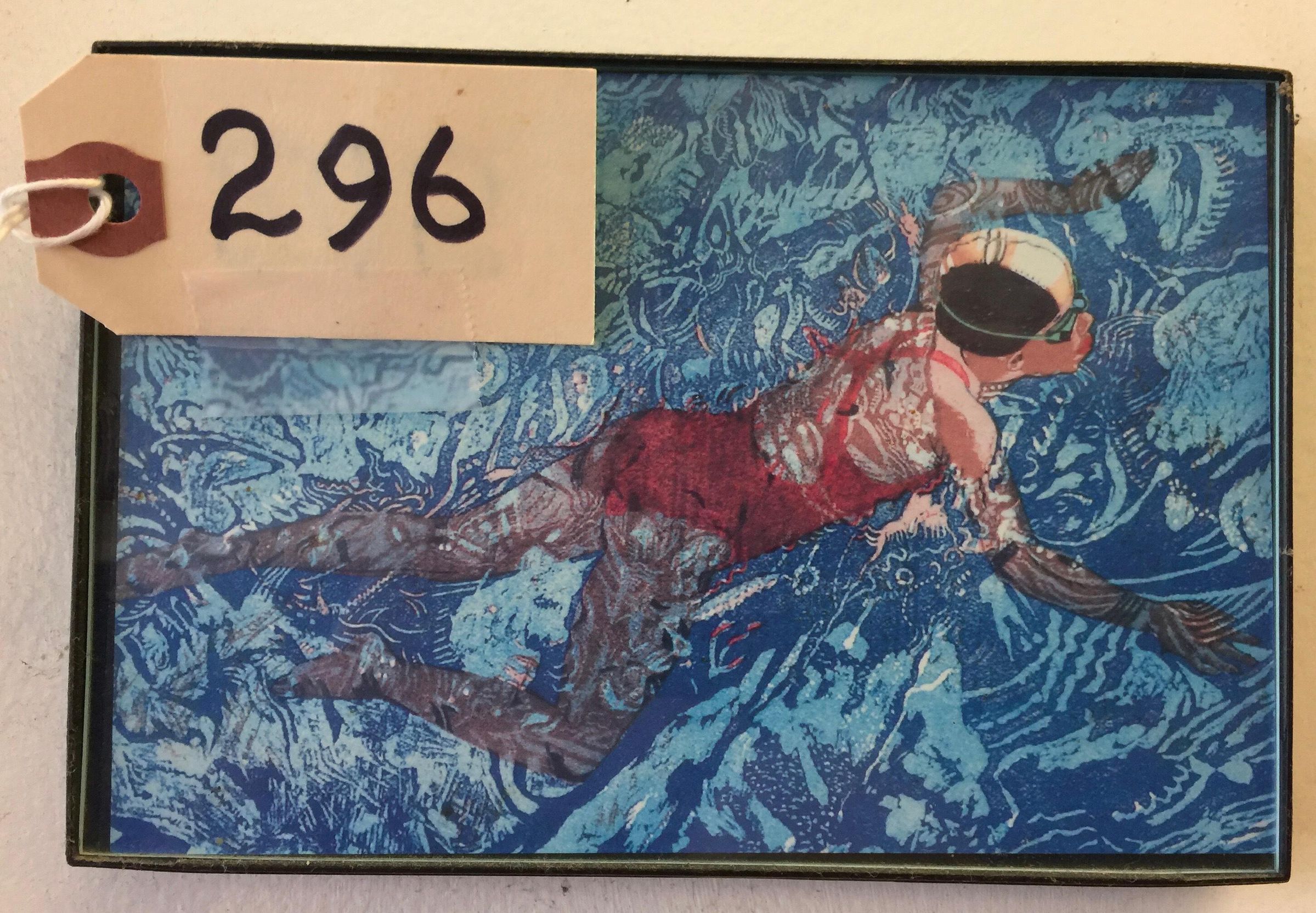 Framed print of woman in red swimsuit and black and white swim cap, looking down on her back. She is doing breaststroke and swimming in multi-tone blue water.Made/Created