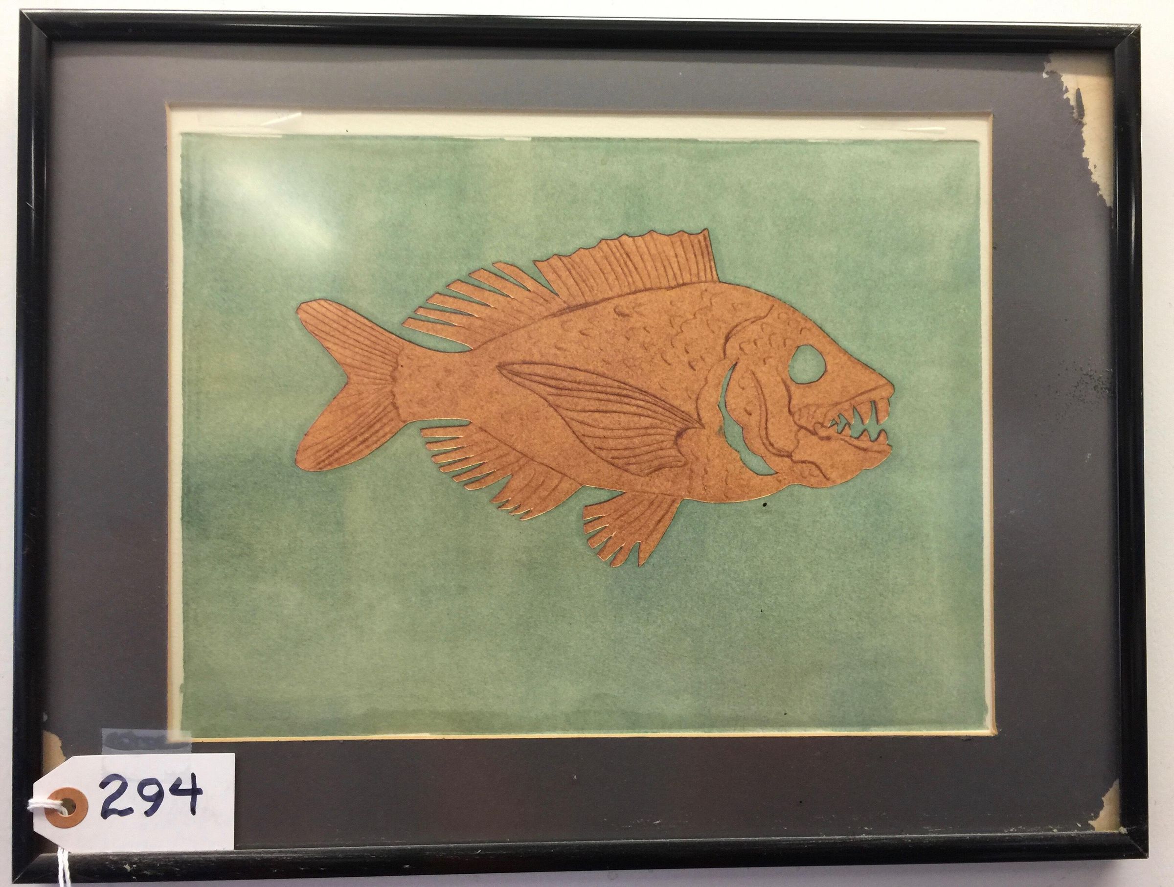 Print of side view of orange rockfish facing to right, on green background. In black metal frame with glass, dark gray mat.Made/Created
