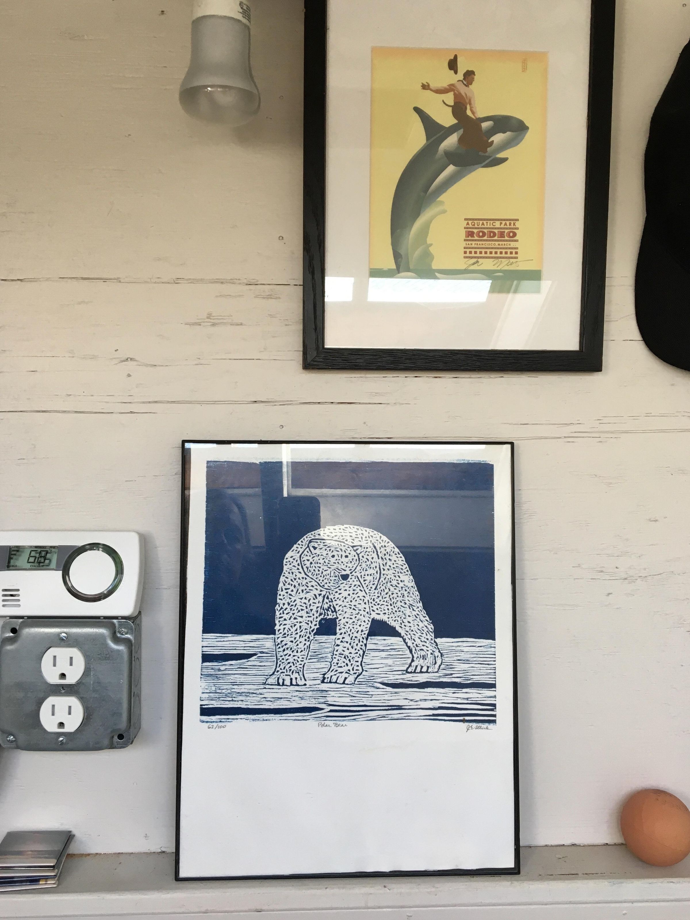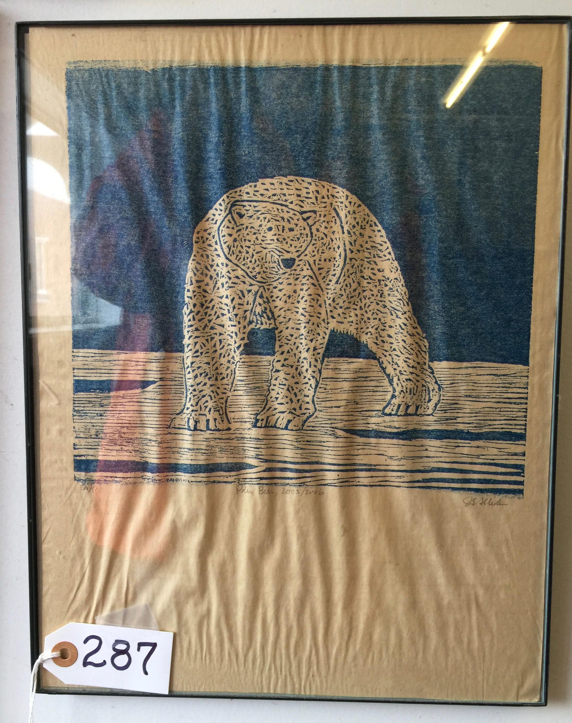 Woodblock print of blue flecked polar bear in blue white ice with blue background. Printed on beige paper in black frame with glass.